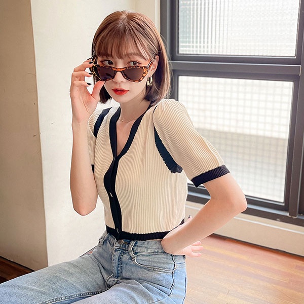 LULUS【A01210793】Y配色邊針織短袖上衣2色0923