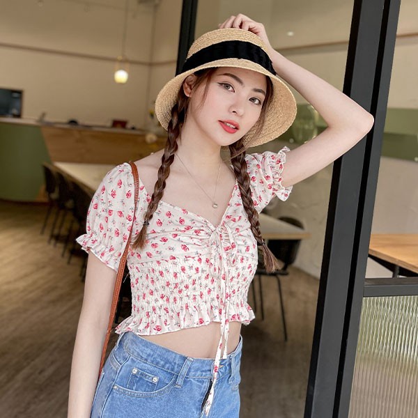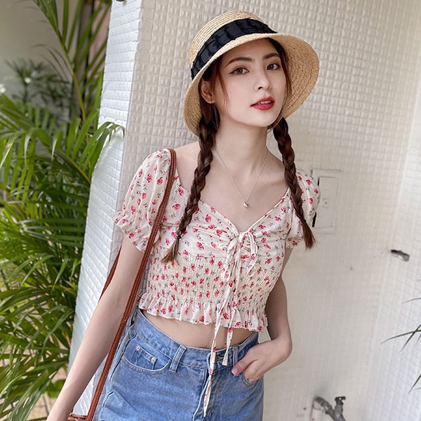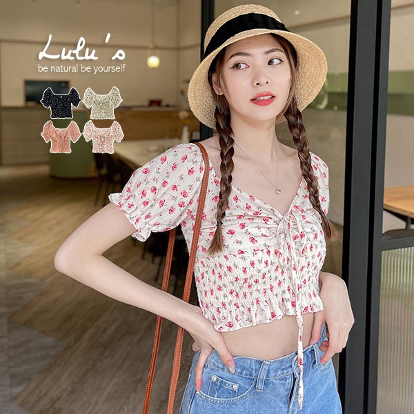 LULUS【A01210050】Y碎花縮腰綁帶上衣4色0304