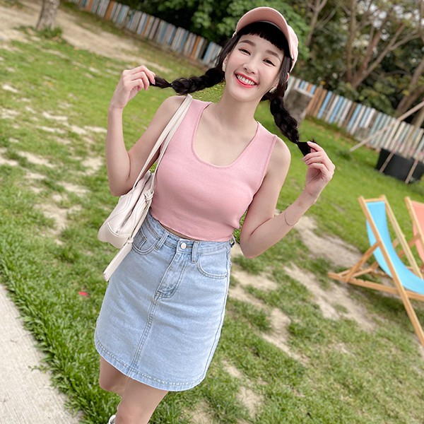LULUS【A05210031】C配色車線牛仔短裙S-L淺藍0415
