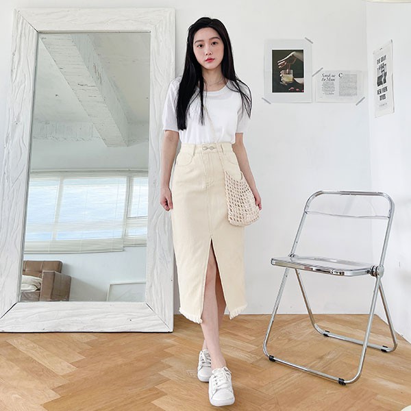 LULUS【A05210080】P雙釦開叉抽鬚中裙S-L米白0729
