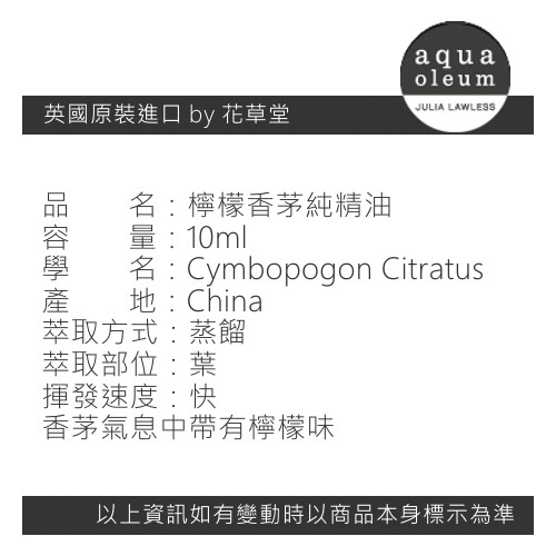 AO 檸檬香茅純精油 10ml。Lemongrass。Aqua Oleum 英國原裝