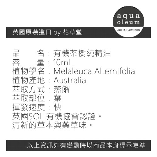 AO 有機茶樹純精油 10ml。Tea Tree Organic。Aqua Oleum 英國原裝