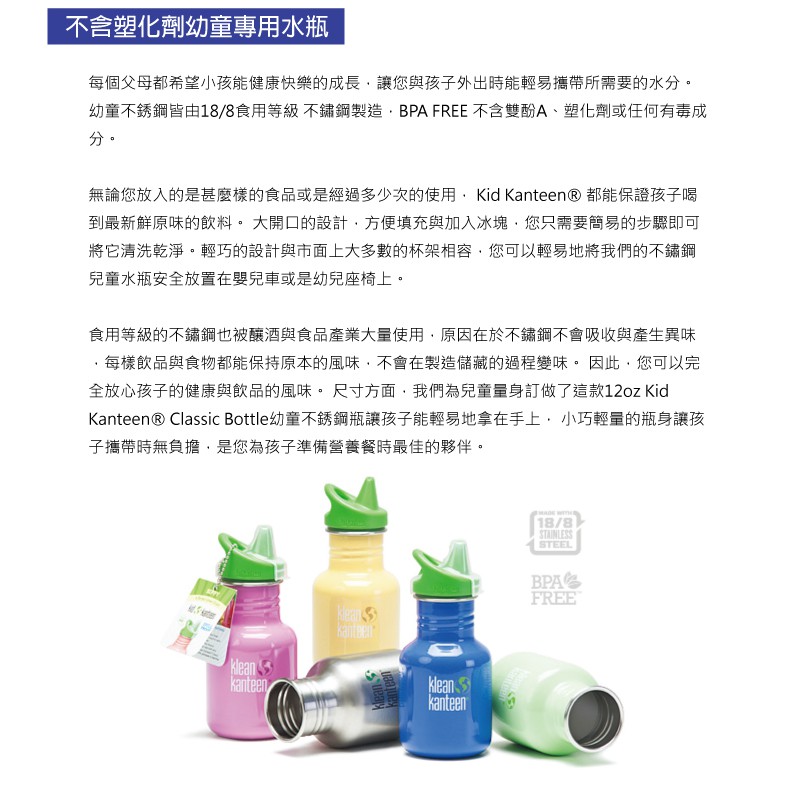 【美國Klean Kanteen】幼童不鏽鋼吸嘴水瓶-355ml