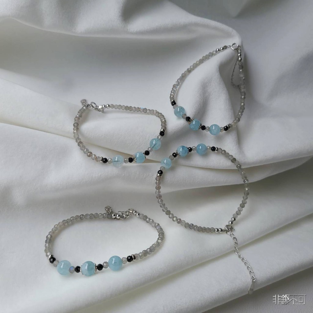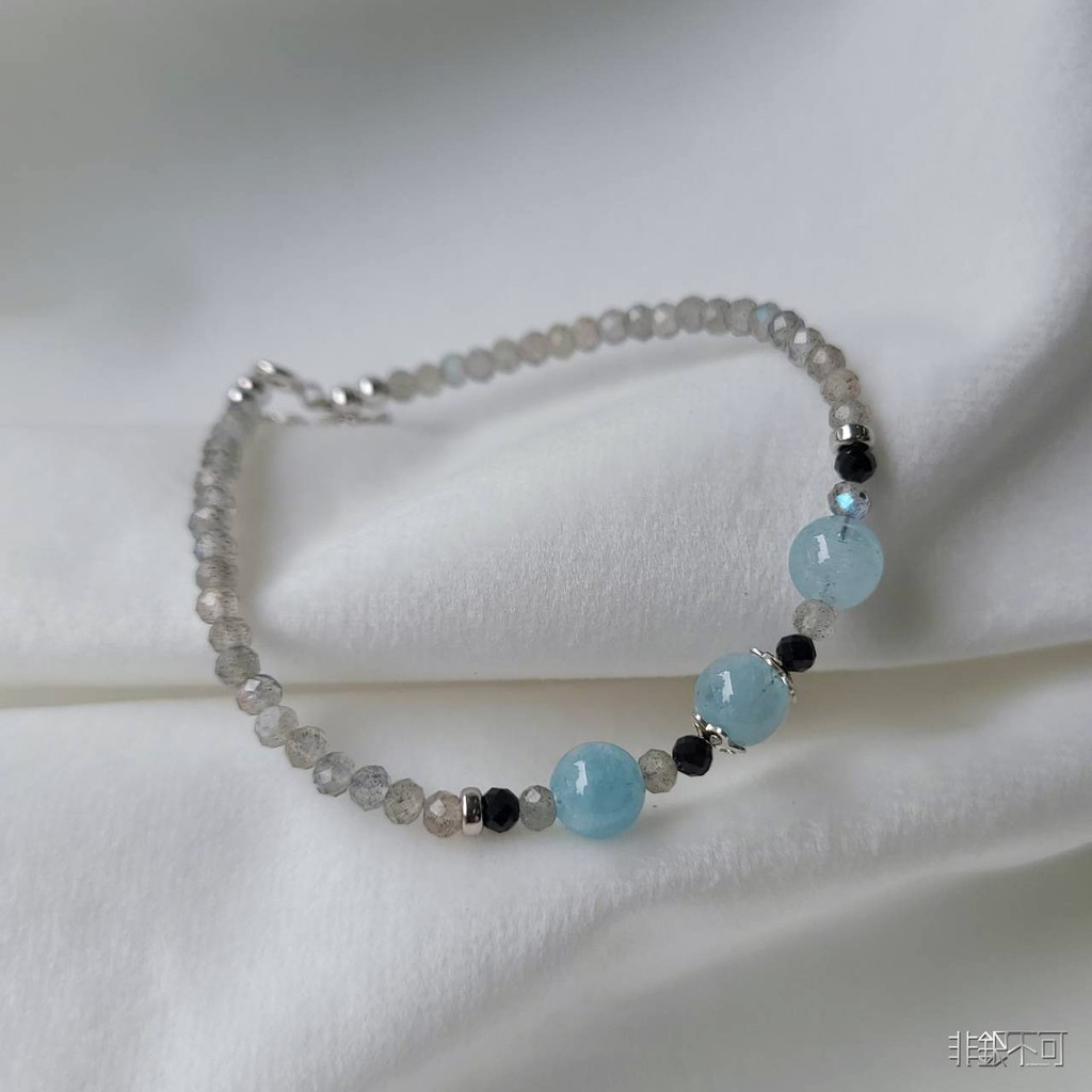 【非銀不可】天然海藍寶.拉長石.黑尖晶 純銀手鍊 (獨家設計)