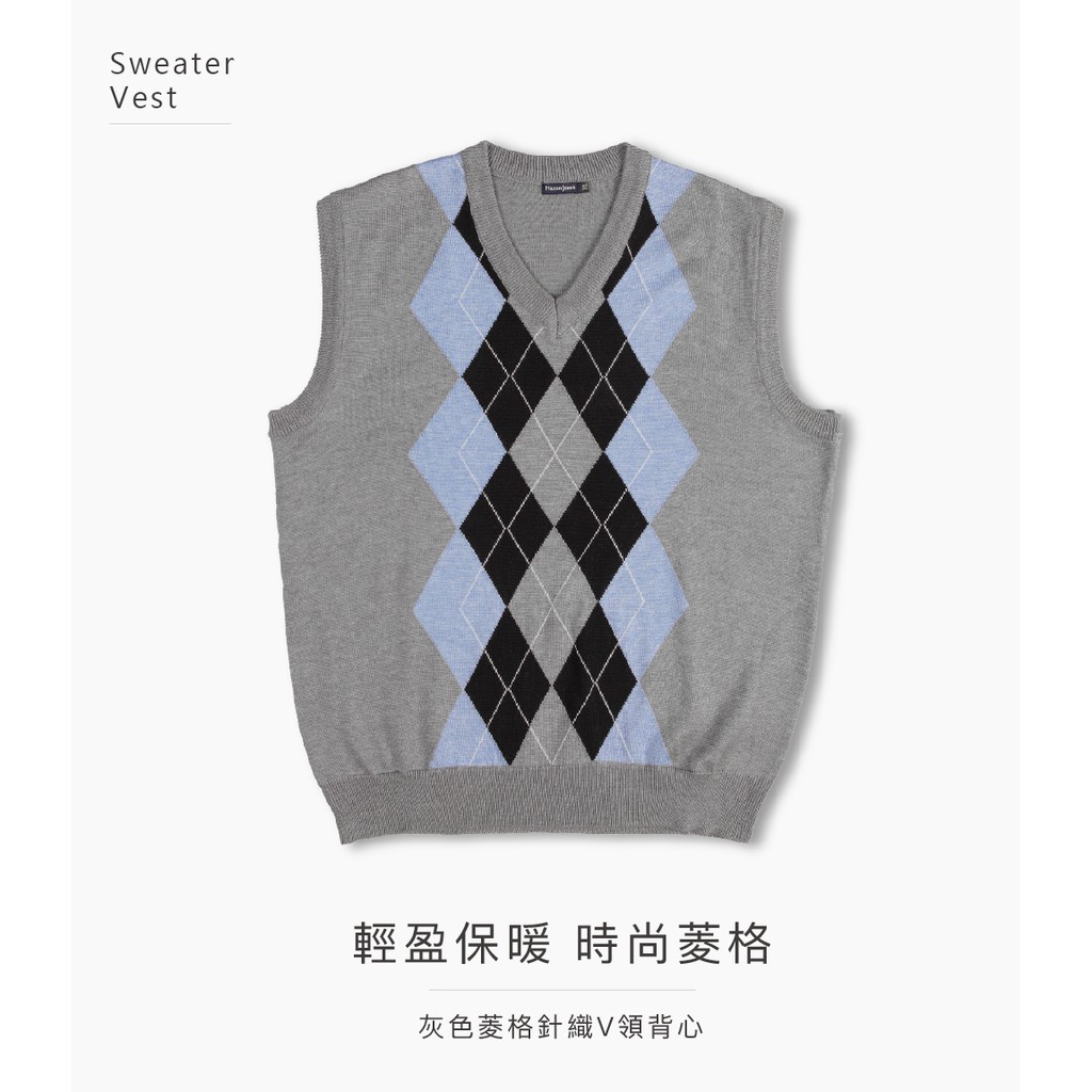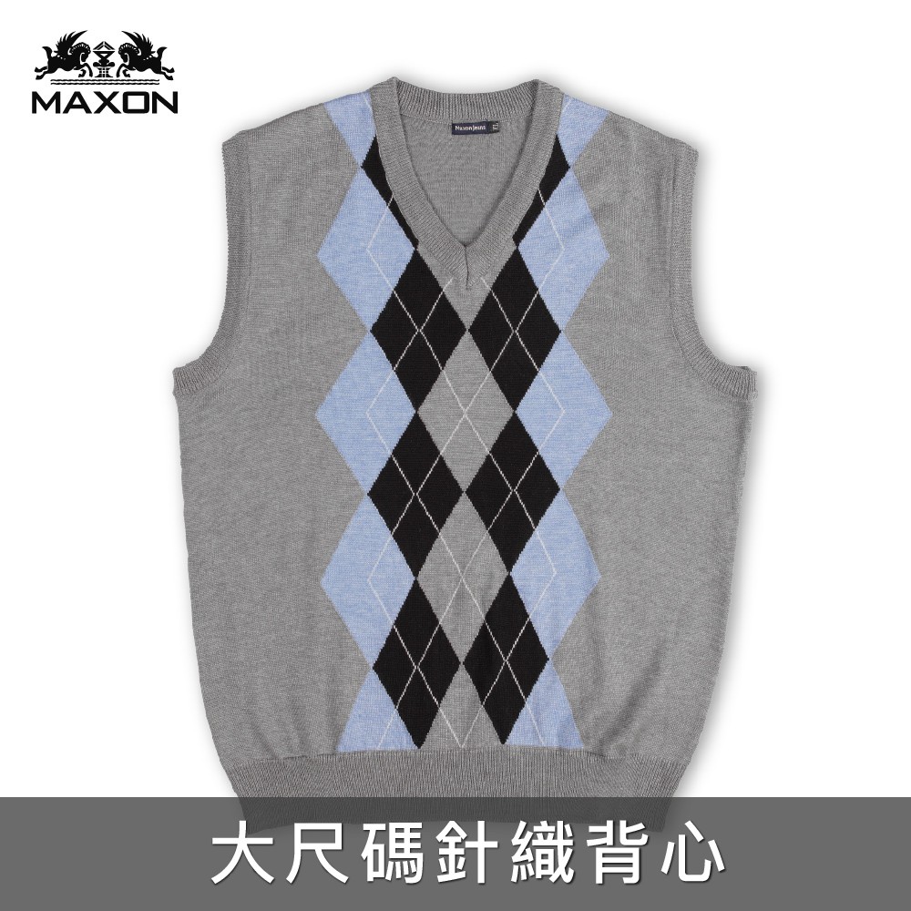 【MAXON大尺碼】台灣製淺灰色羊毛藍菱格針織V領背心XL~4XL 復古風 面試 工作 搭配襯衫 特價 免運