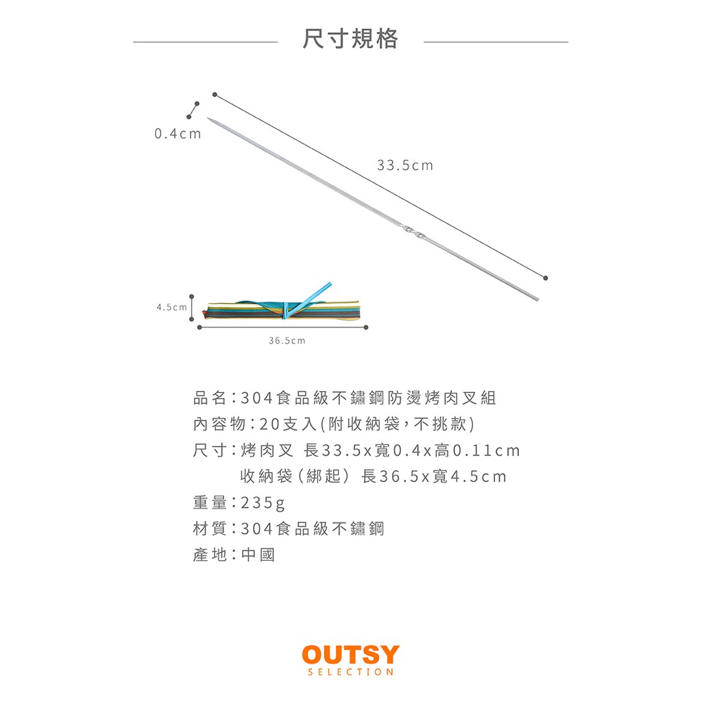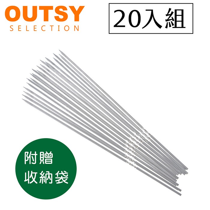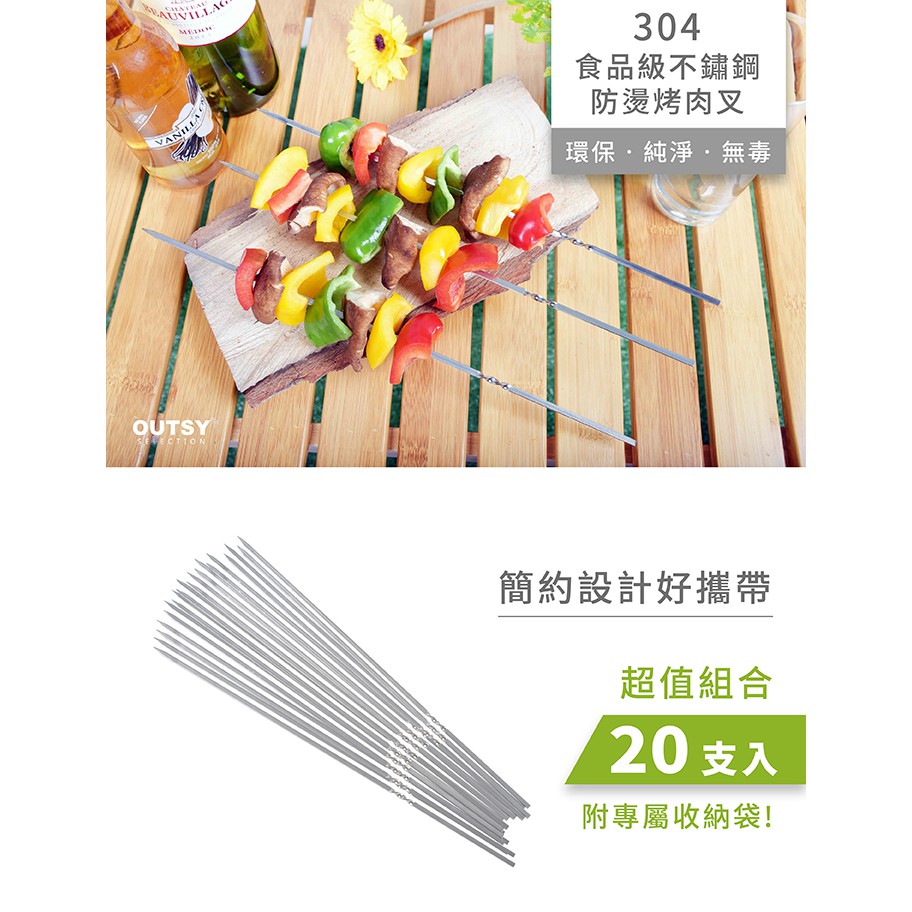 【OUTSY嚴選】304食品級不鏽鋼防燙烤肉叉20支入(附收納袋)