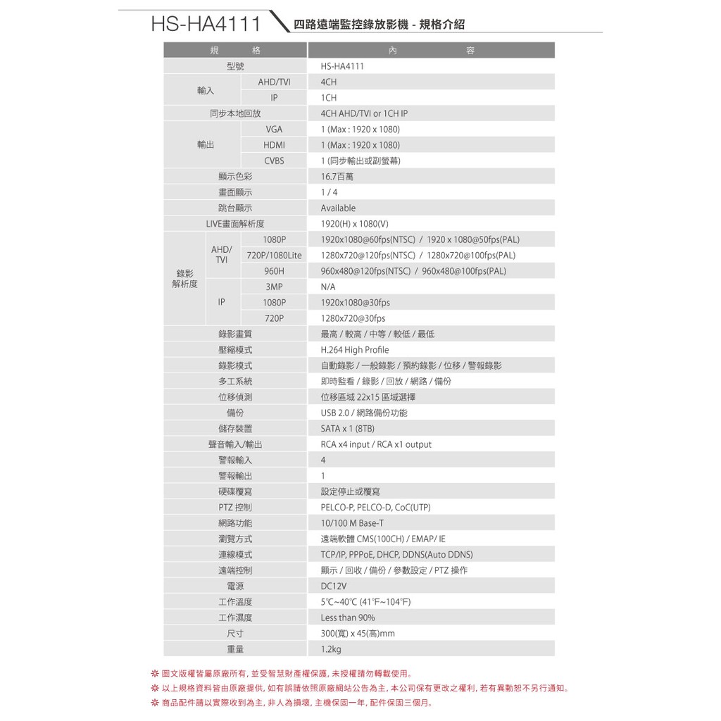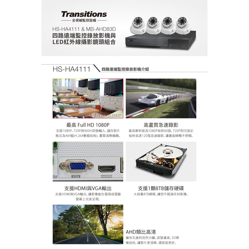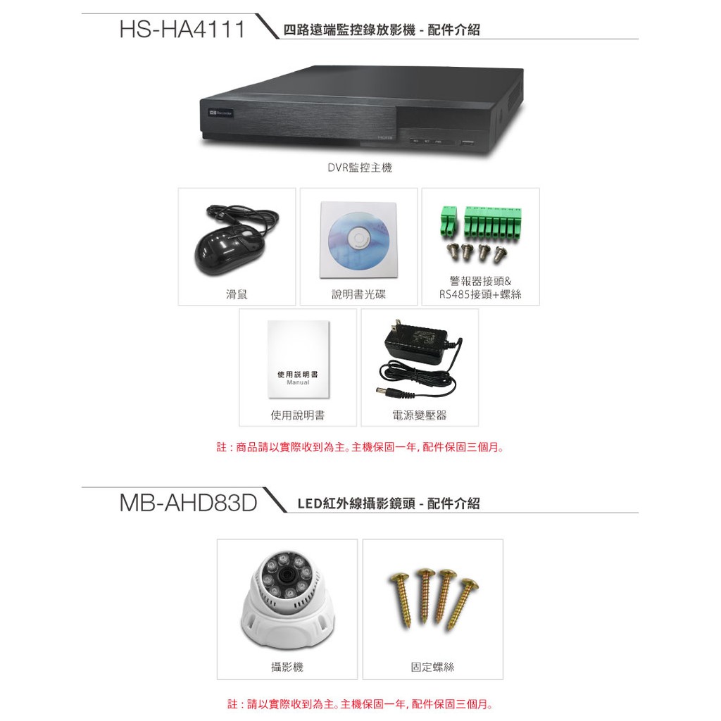 【凱騰】全視線 4路監視監控錄影主機(HS-HA4111)+LED紅外線攝影機(MB-AHD83D) 台灣製造