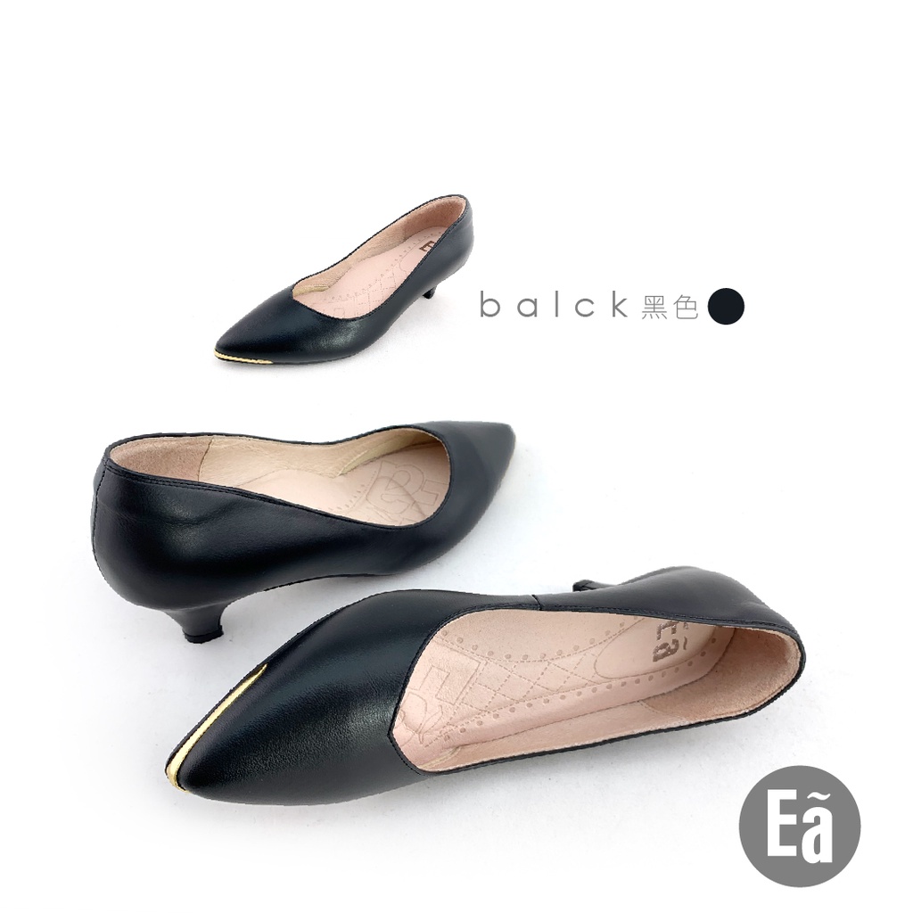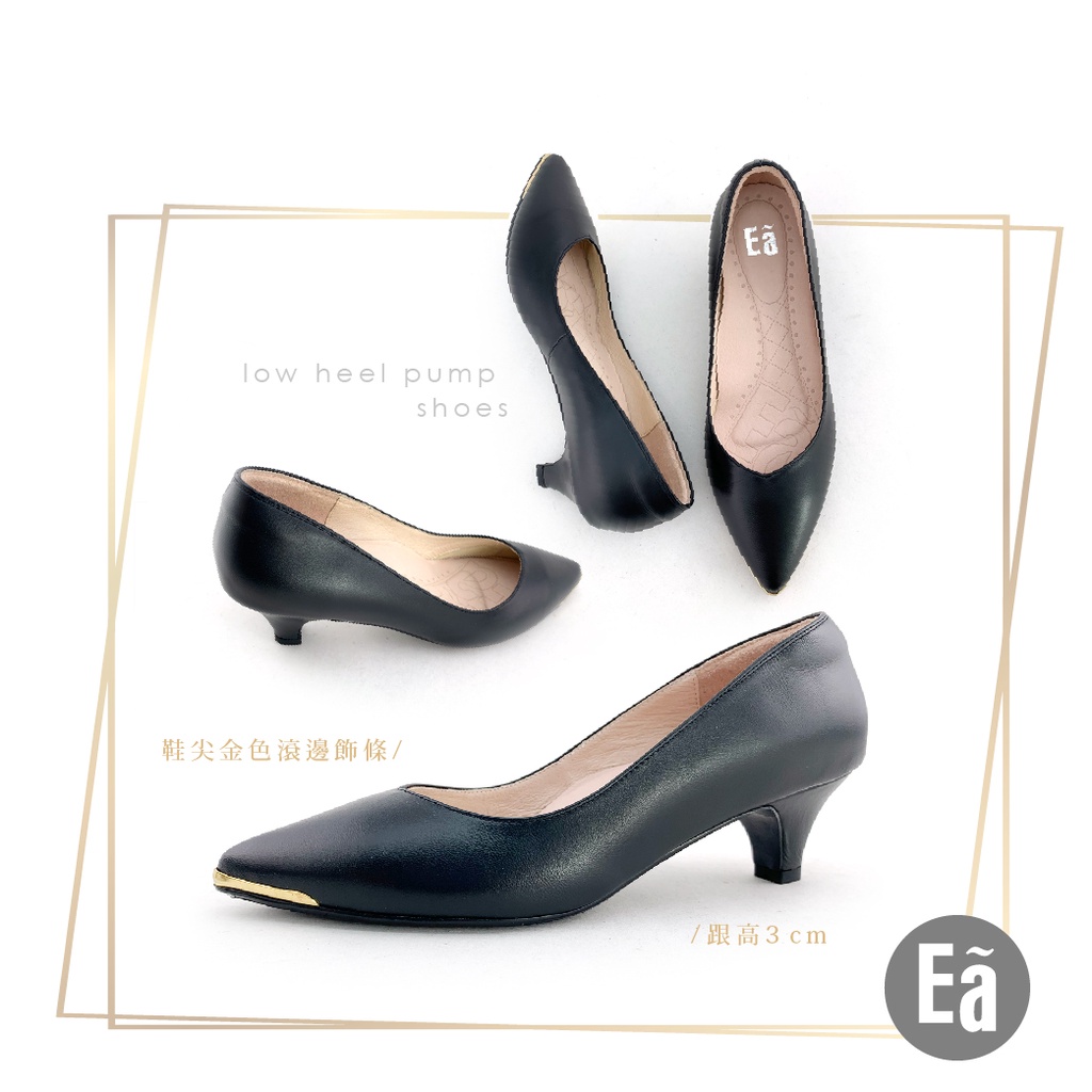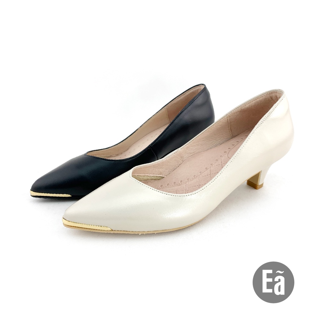 Ea專櫃真皮女鞋 真皮珠光素色尖頭金邊3公分低跟淺口正裝鞋 上班鞋(珠光白/黑)7327