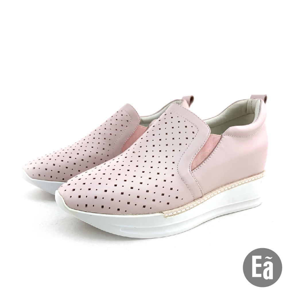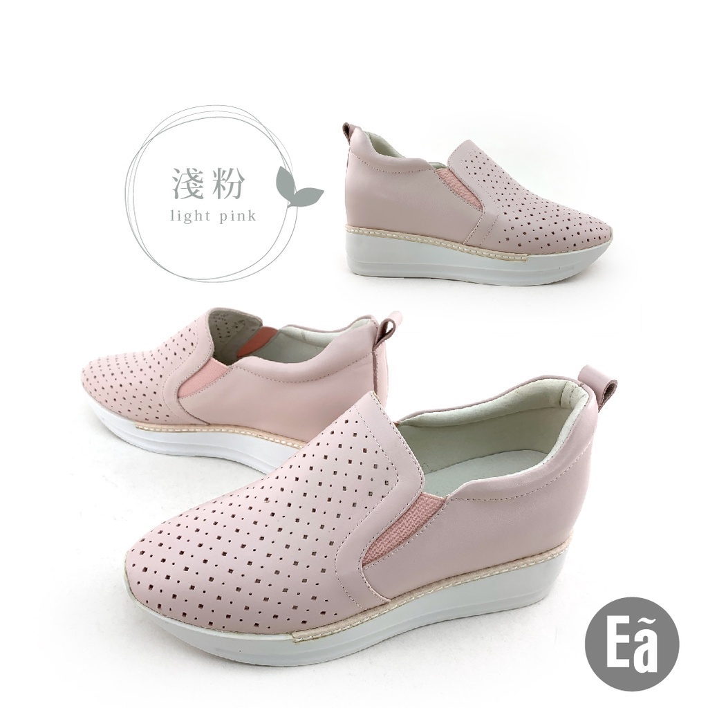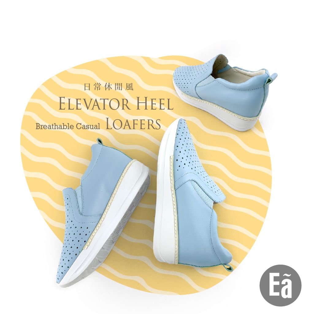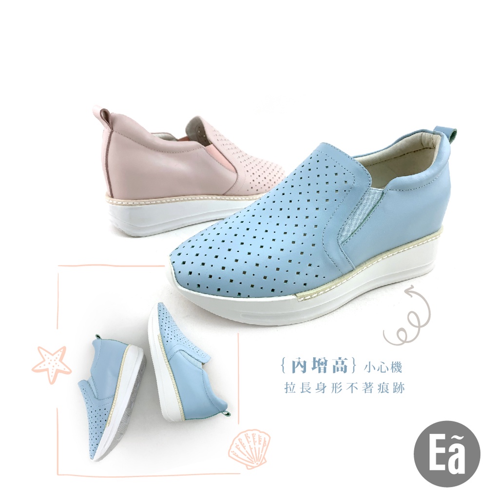 Ea專櫃真皮女鞋 真皮粉彩 日常休閒鏤空沖孔內增高厚底休閒鞋懶人樂福鞋(水藍/淺粉)9373