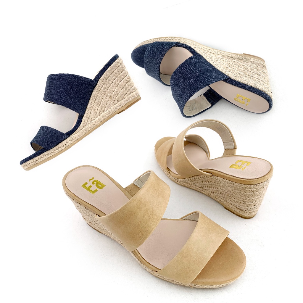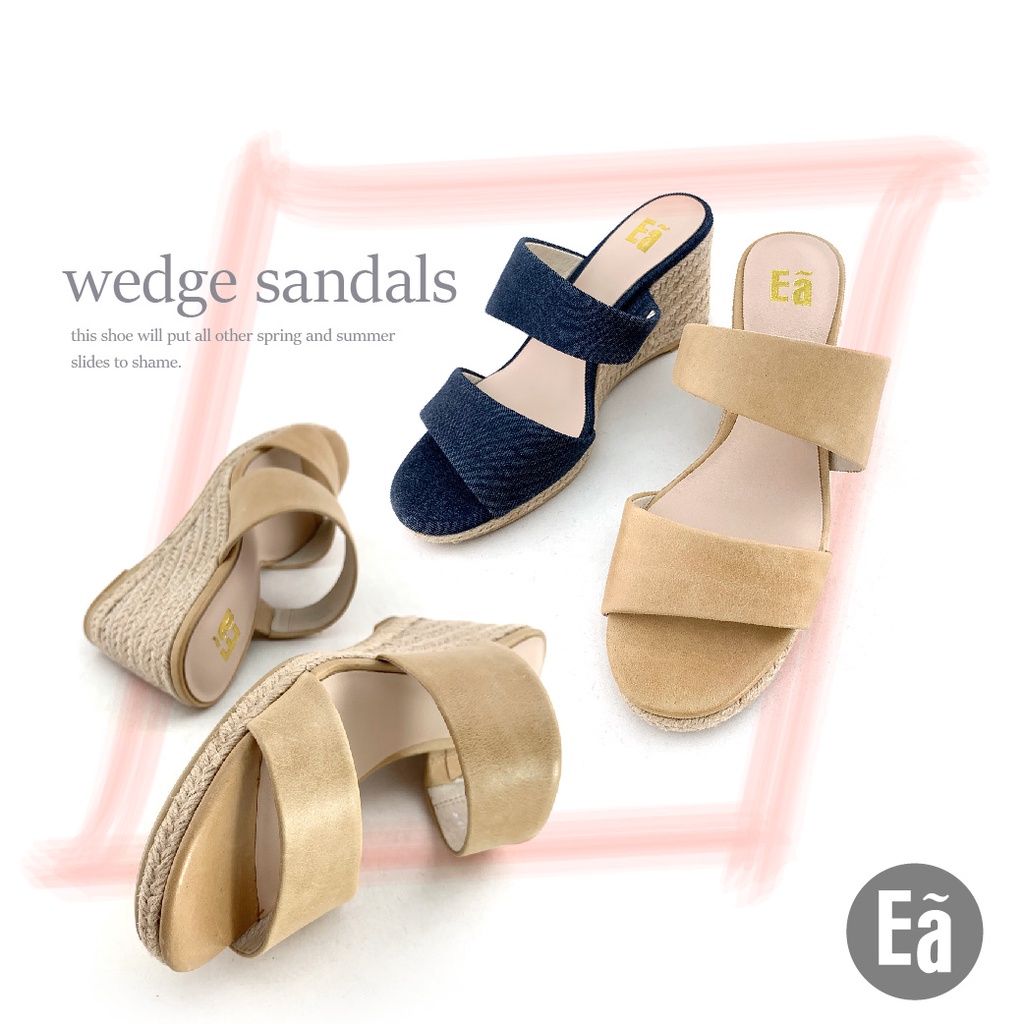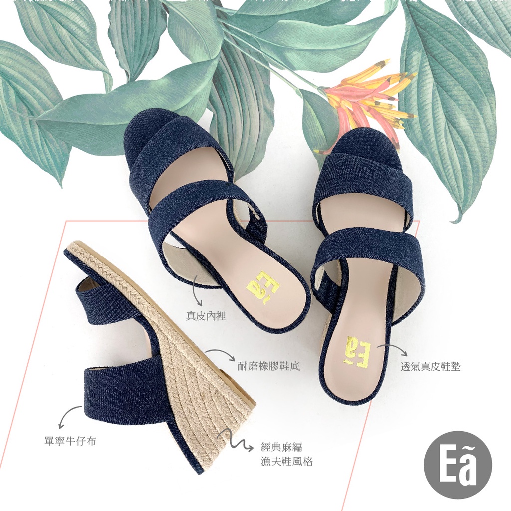 Ea專櫃真皮女鞋 真皮簡約無印風單寧牛仔一字帶麻繩編織楔型高跟涼鞋(淺駝/牛仔藍)9415