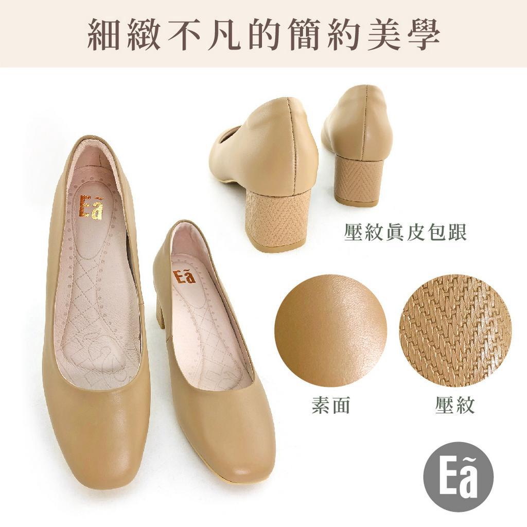 Ea專櫃真皮女鞋 真皮素面異材質拼接方頭中跟鞋5cm (卡其/深綠)0606