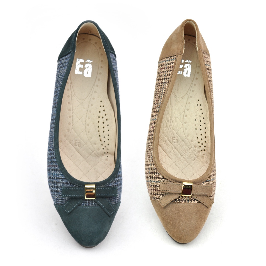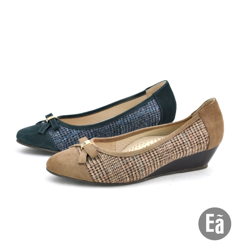 Ea專櫃真皮女鞋 千鳥格紋布 蝴蝶結 小尖頭 楔型鞋(咖啡/藍綠)8632