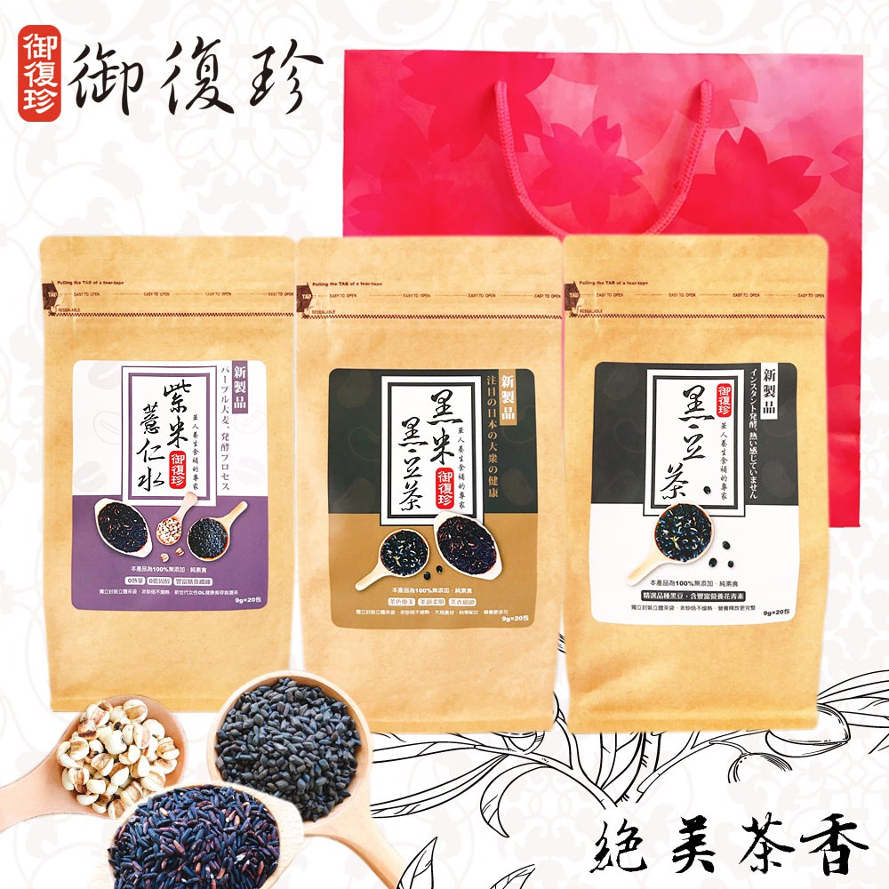 【御復珍】絕美茶香嚴選禮袋組 獨特熟化技術 不燥熱 清香甘甜 甘潤 甘香(黑豆茶+黑米黑豆茶+紫米薏仁茶)