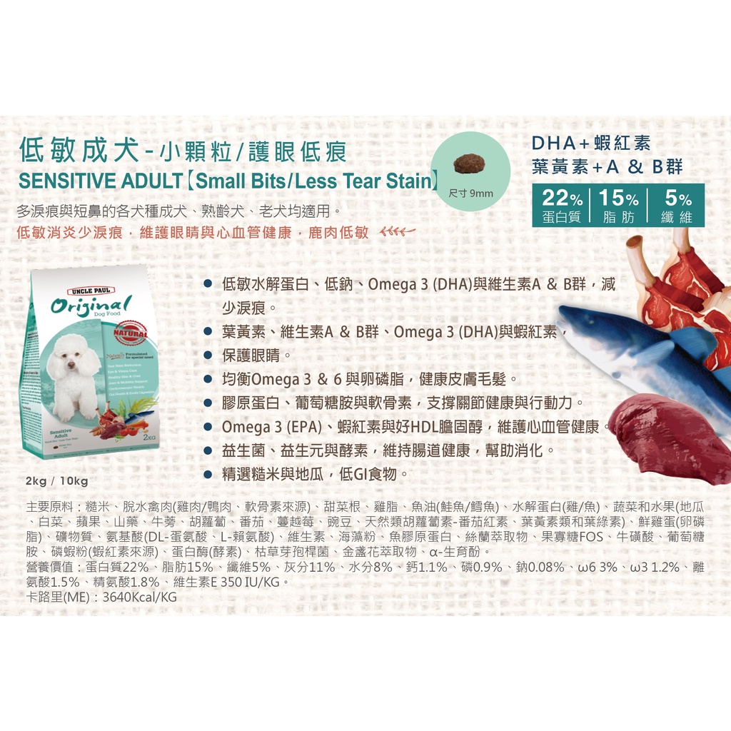 保羅叔叔田園生機狗糧 狗飼料-低敏護眼保健 2KG -成犬 全齡犬 室內犬 白貴賓 短鼻狗 小顆粒