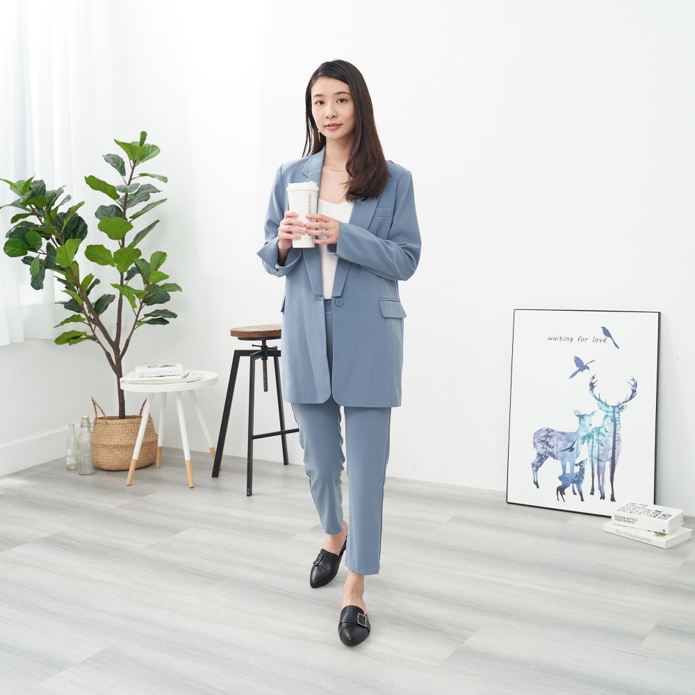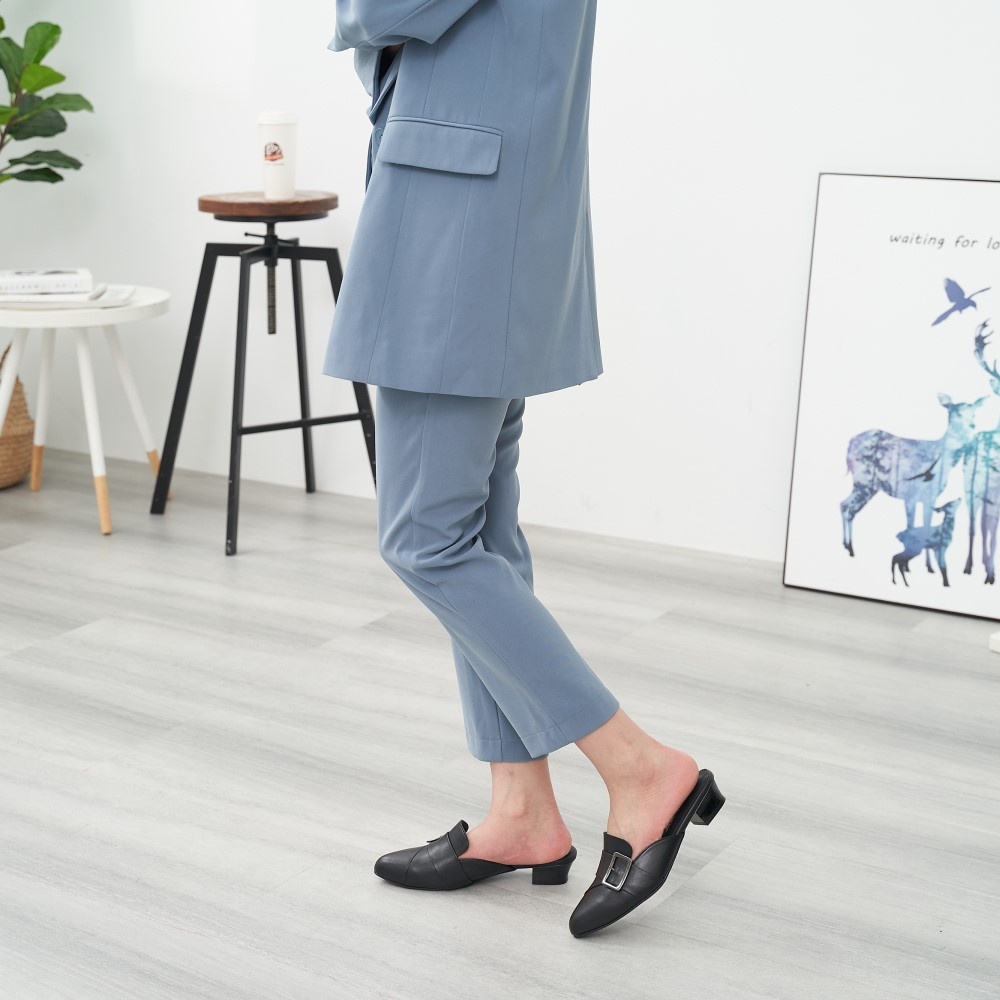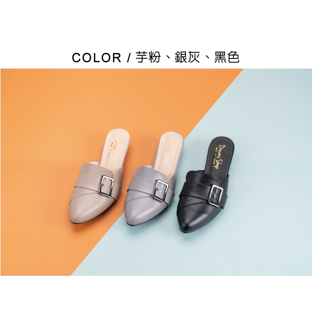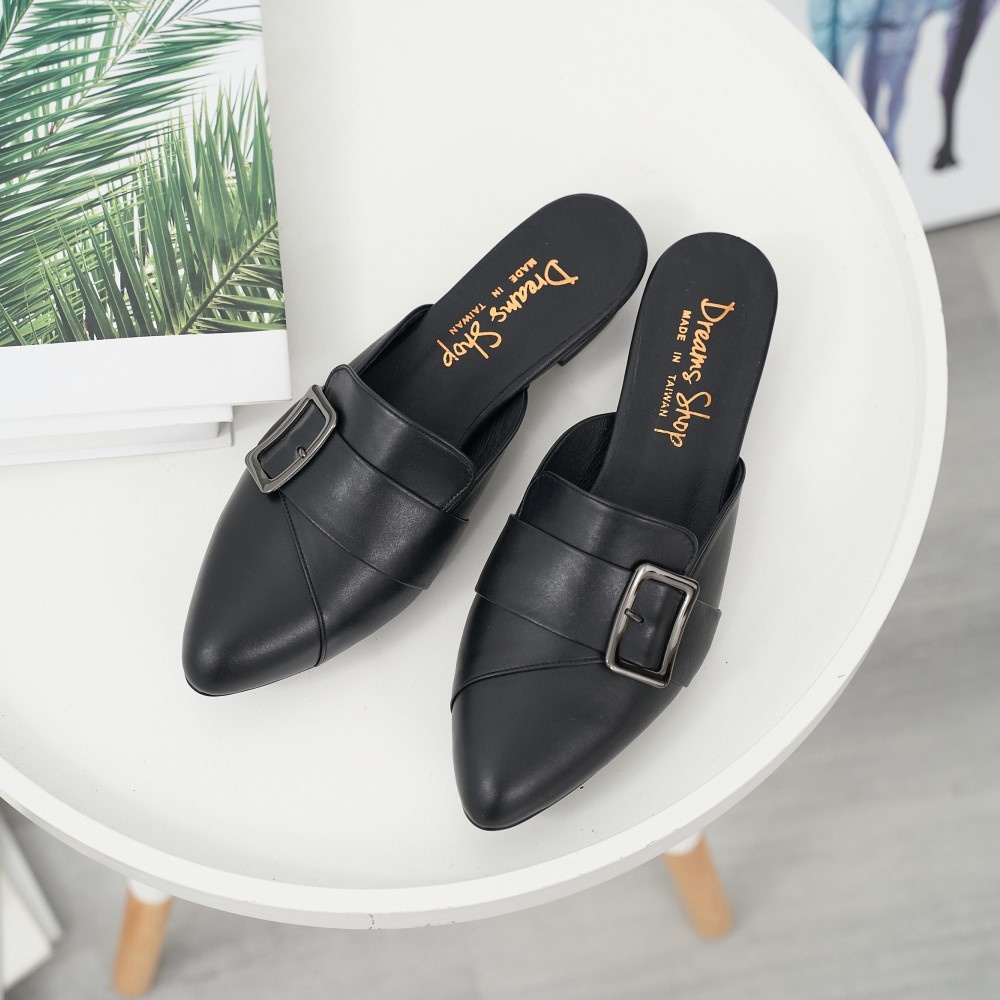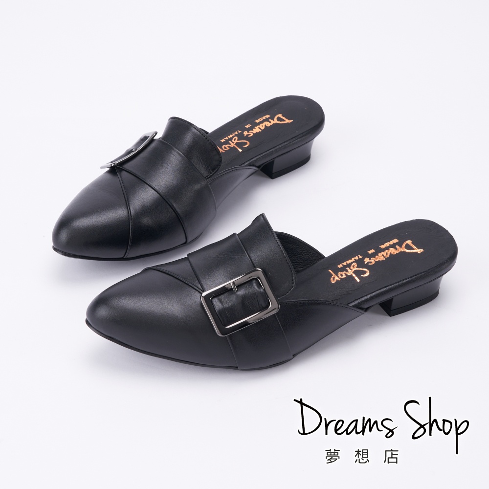 DREAMS SHOP MIT真皮方釦帶尖頭低跟穆勒鞋3cm 黑色【XJ100-2】大尺碼女鞋37-45