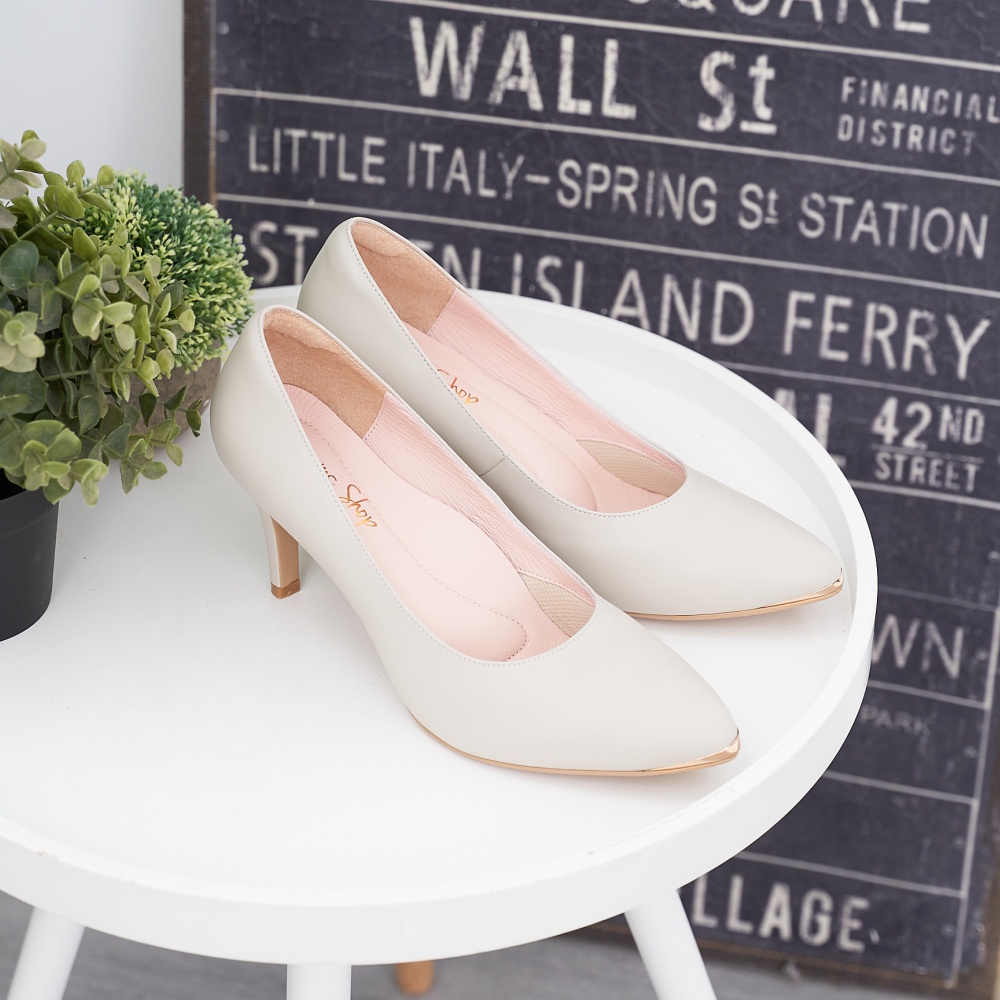 DREAMS SHOP 氣墊_MIT真皮金屬V頭尖頭高跟鞋 米灰【HC9209-A31】大尺碼女鞋37-44