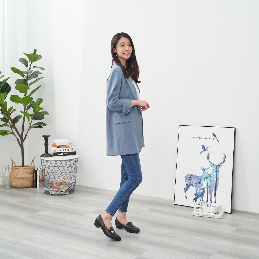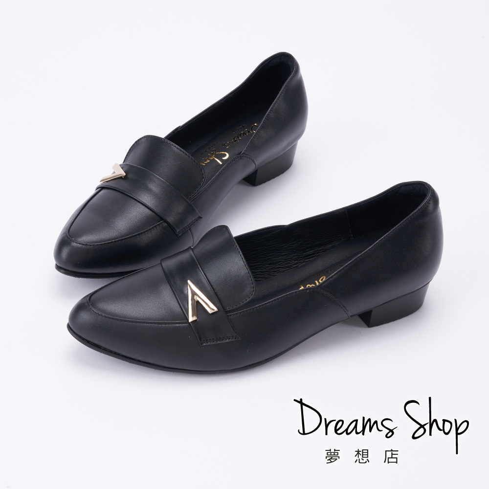 DREAMS SHOP 寬楦_MIT真皮V釦尖頭低跟樂福鞋 黑色【XJ1015-7】大尺碼女鞋37-45