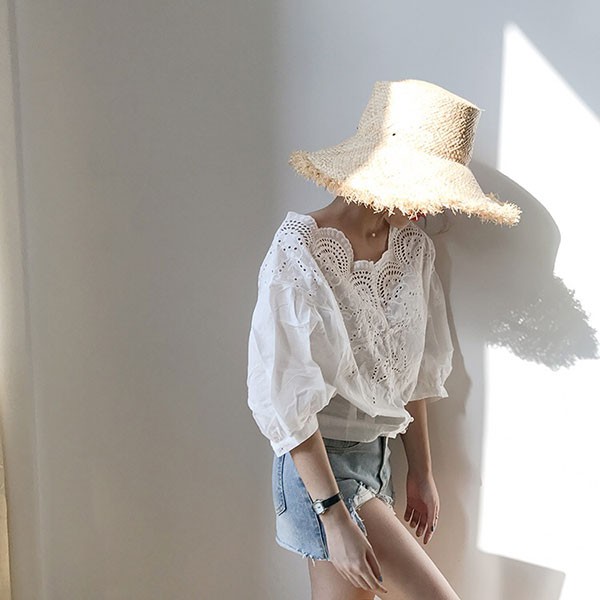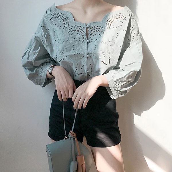 NXS 日系 緹花 蕾絲 上衣 襯衫 棉麻 簍空 雕花 洞洞 七分袖 短袖 顯瘦 百搭 氣質 純白 小清新 刺繡