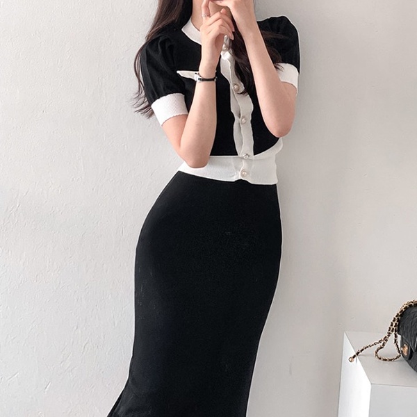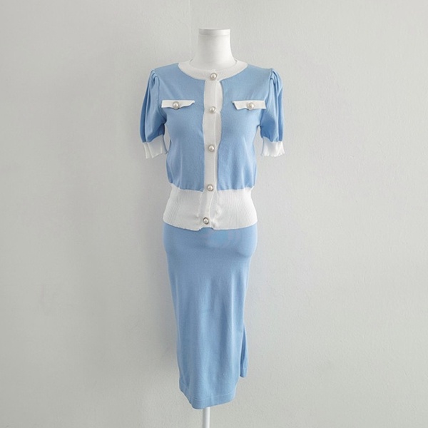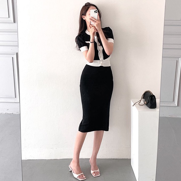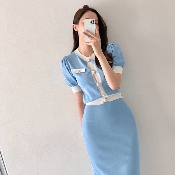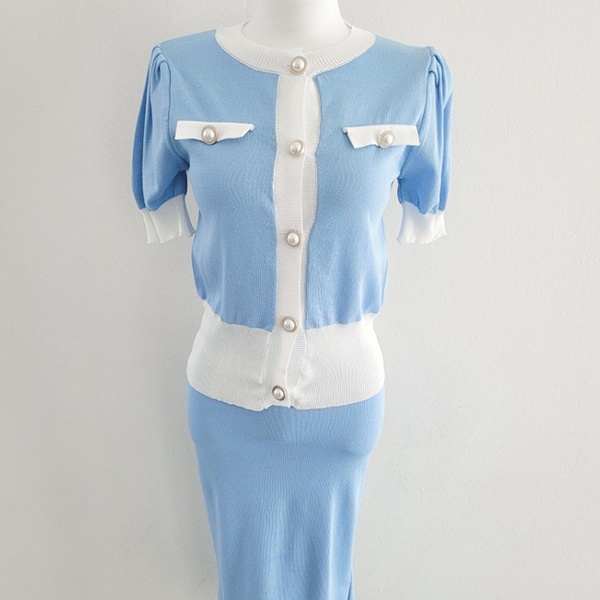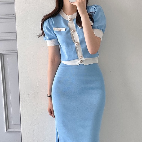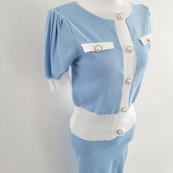 NXS 正韓 公主袖小香針織套裝 珍珠釦 包裙 半身裙 短袖上衣 針織衫 小香風 韓劇 貴婦 名媛 氣質 韓國
