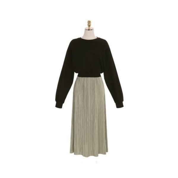 NXS 正韓 洋裝 拼接 珠光 百褶裙 長洋 長裙 長袖 長洋裝 百折裙 氣質 上班族 婚禮 顯瘦 光澤 韓國