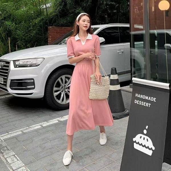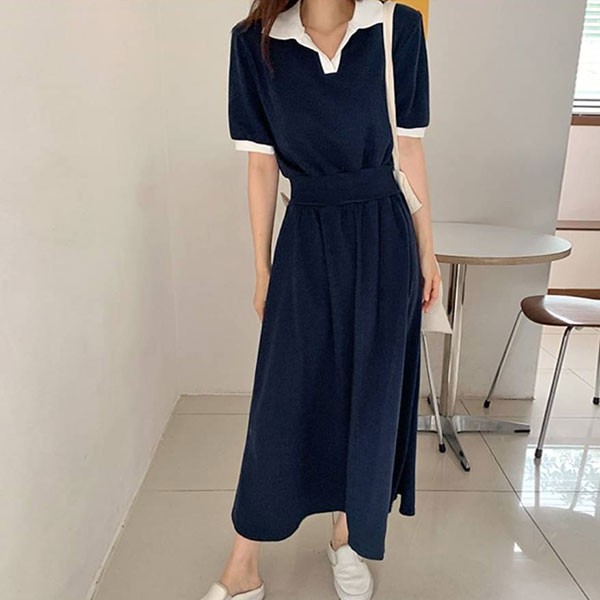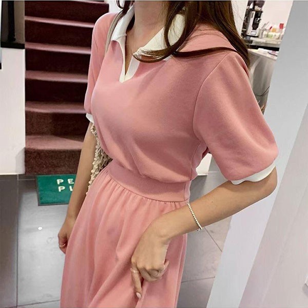 NXS 正韓 POLO領 洋裝 短袖 連身裙 長洋 長裙 長洋裝 襯衫 顯瘦 縮腰 文青 V領 韓國