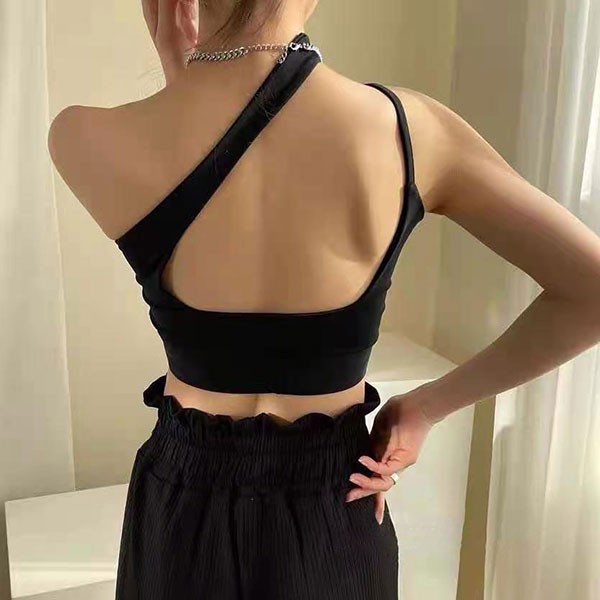NXS 韓國多穿式背心 小可愛 斜肩 鎖骨 細肩帶 不對稱 設計感 露背 掛脖 冰絲 胸墊 罩杯
