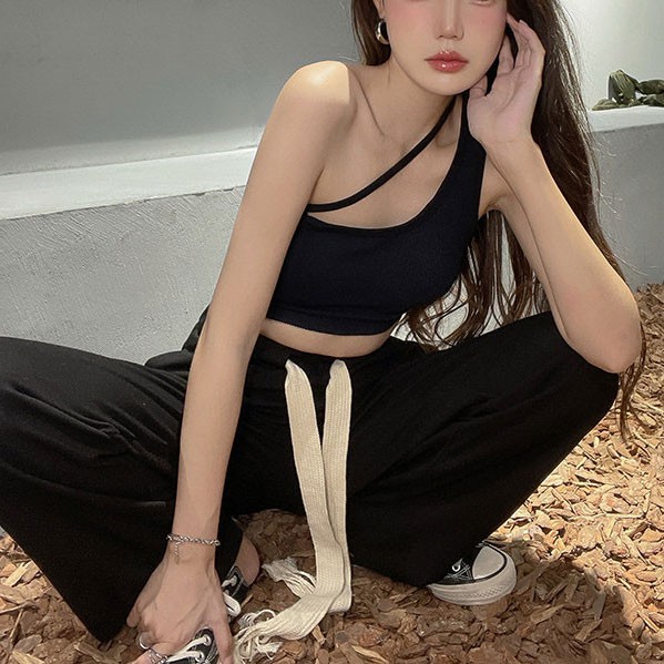 NXS 韓國斜肩背心 小可愛 螺紋 鎖骨 細肩帶 不對稱 設計感 露背 掛脖 胸墊 罩杯 歐美