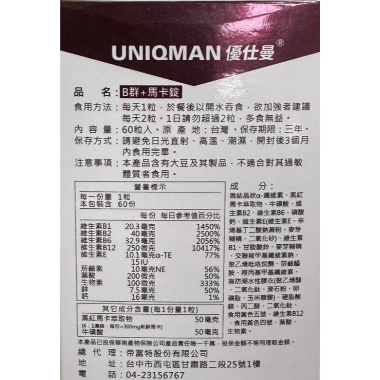 UNIQMAN B群+馬卡錠 (60粒/瓶) 提神/增強體力/男性B群/黑紅馬卡/瑪卡 官方旗艦店