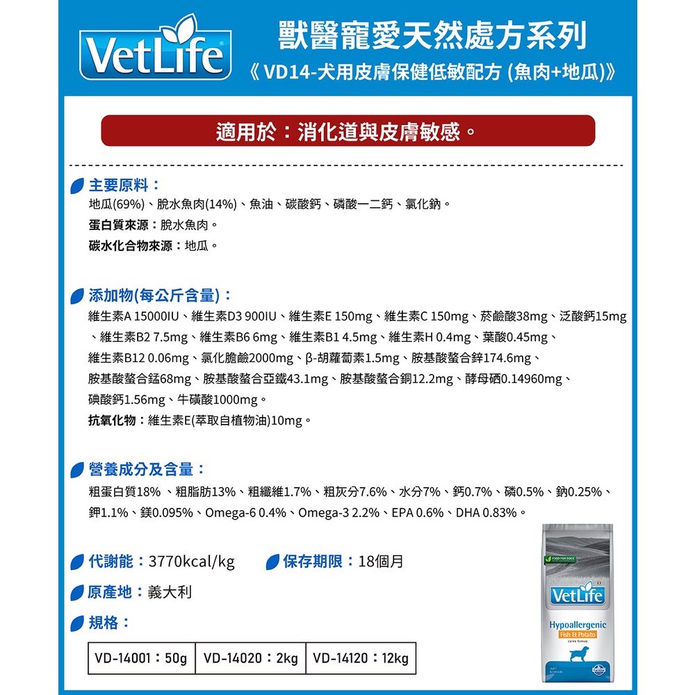 即期良品買一送一 效期4-6個月 2kg 法米納Farmina VD14 犬用皮膚保健低敏配方 魚肉地瓜
