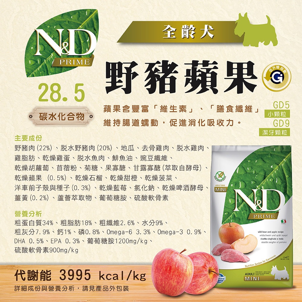 法米納 Farmina【ND天然頂級無穀系列】犬糧 狗飼料 狗糧【GD9 全齡犬野豬蘋果 潔牙顆粒 2.5kg 2.5】