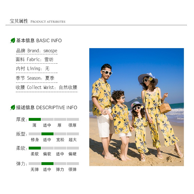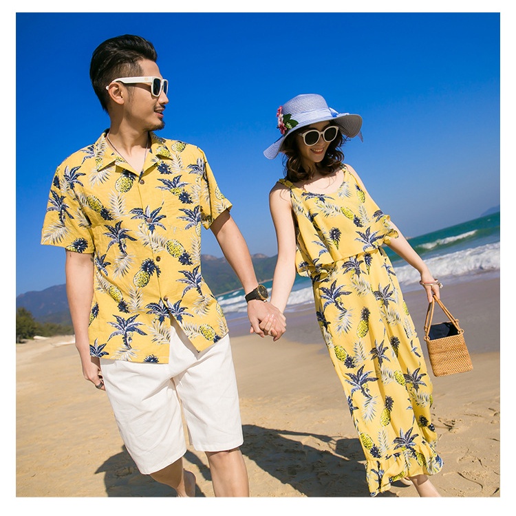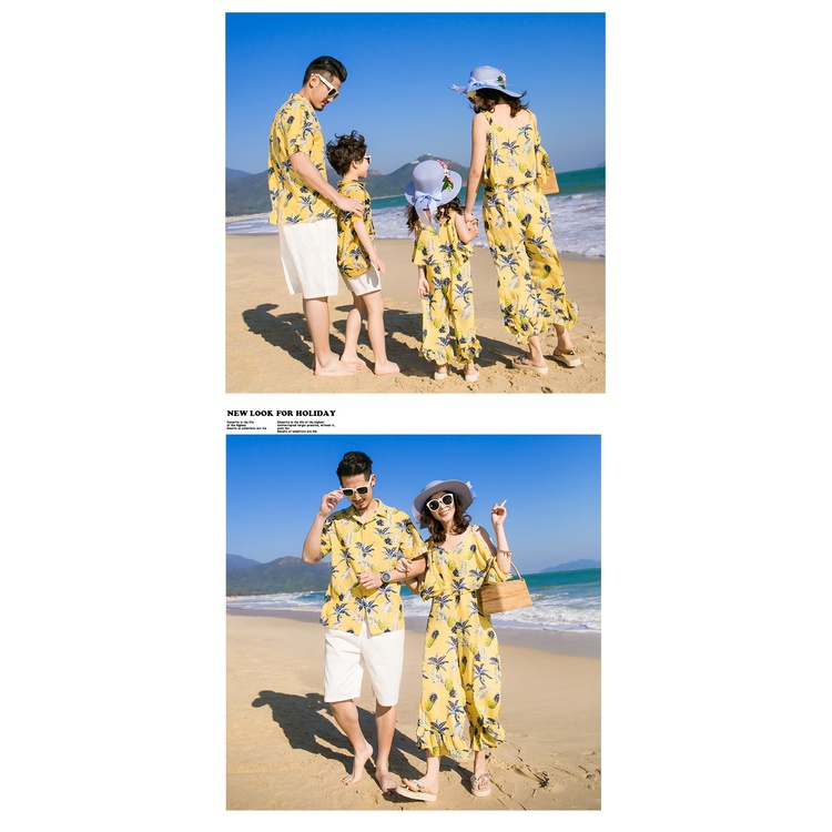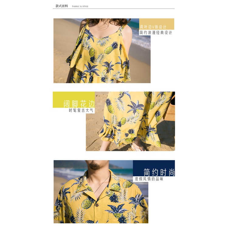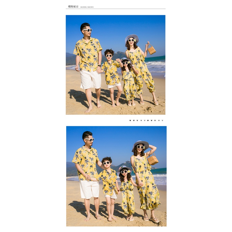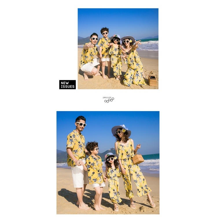海灘渡假黃波蘿細肩背心連身濶腿褲花襯衫親子裝情侶裝