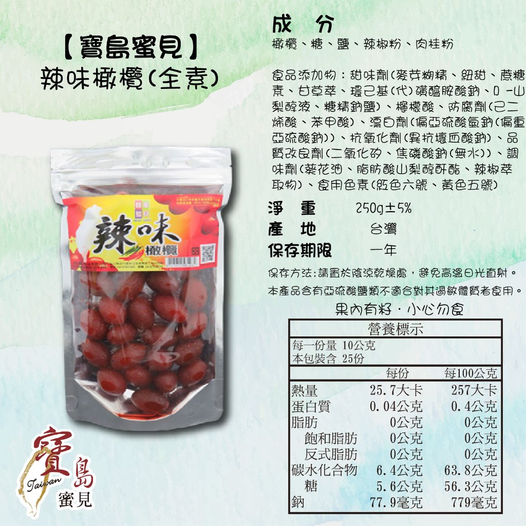 寶島蜜見 辣味橄欖 250公克 全素 寶島蜜餞 橄欖 蜜餞