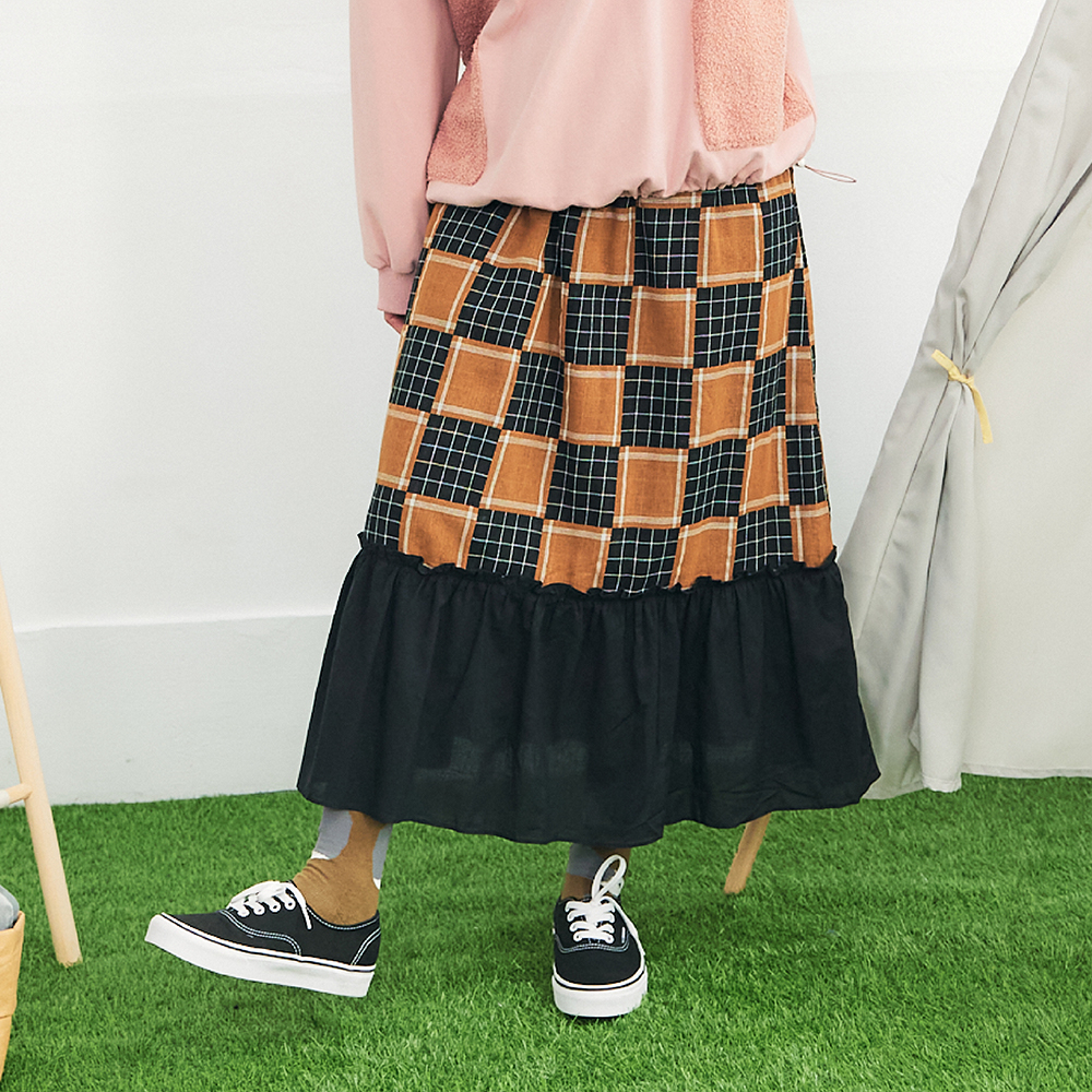 【Dailo】文青復古格紋細褶長裙 黑 綠 咖