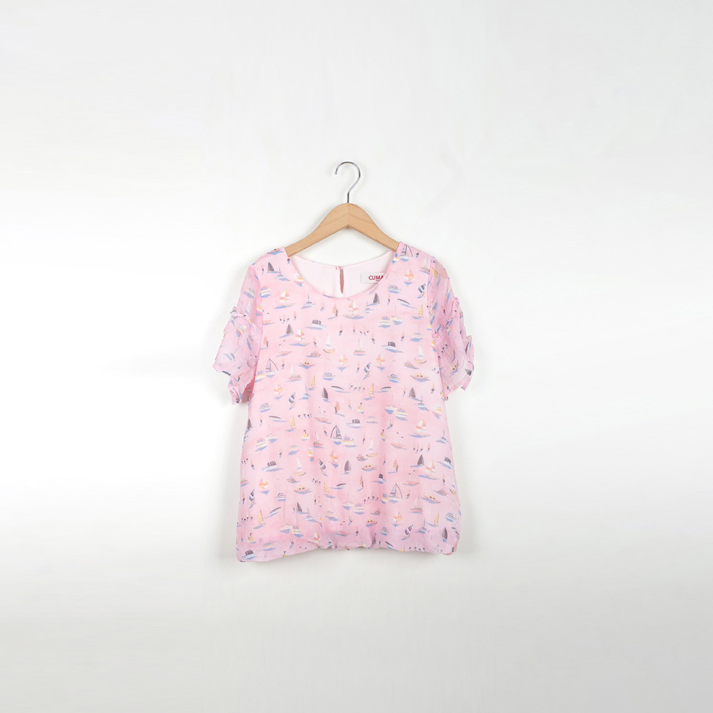 【CUMAR】圓領袖抽縐綁帶短袖上衣 藍 粉
