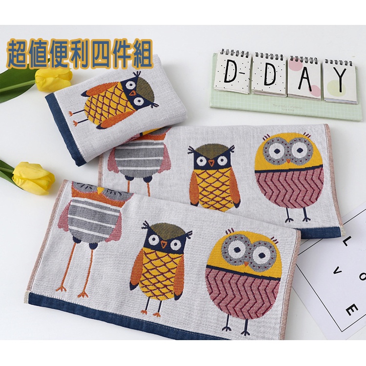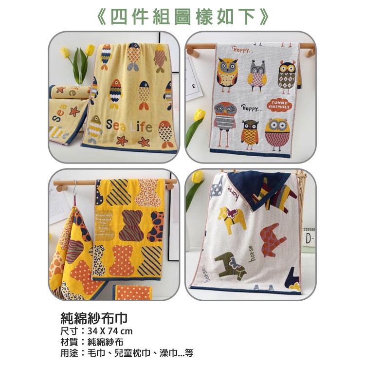 【優貝選】童趣動物純綿柔軟嬰幼兒水洗紗 布洗澡巾 四件組