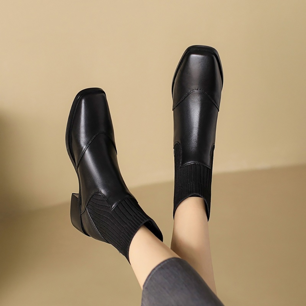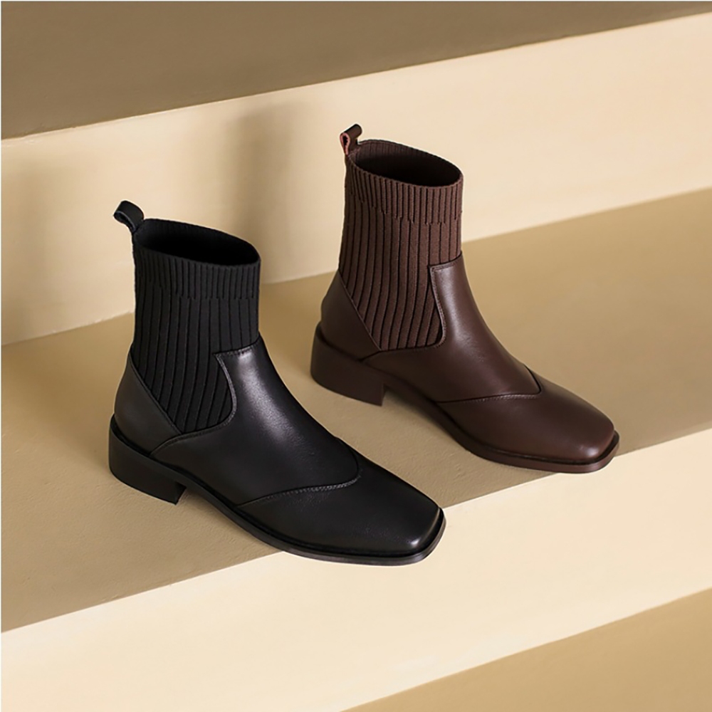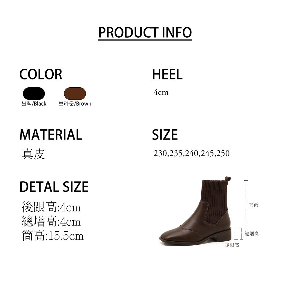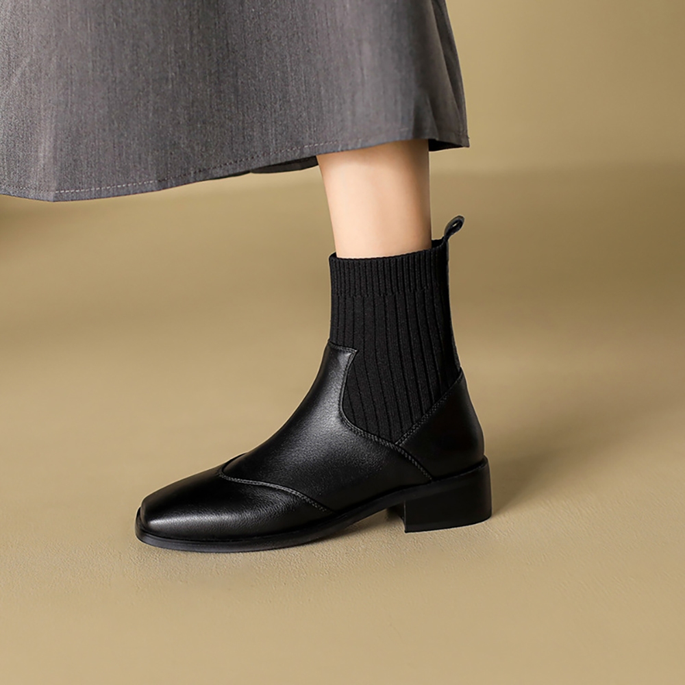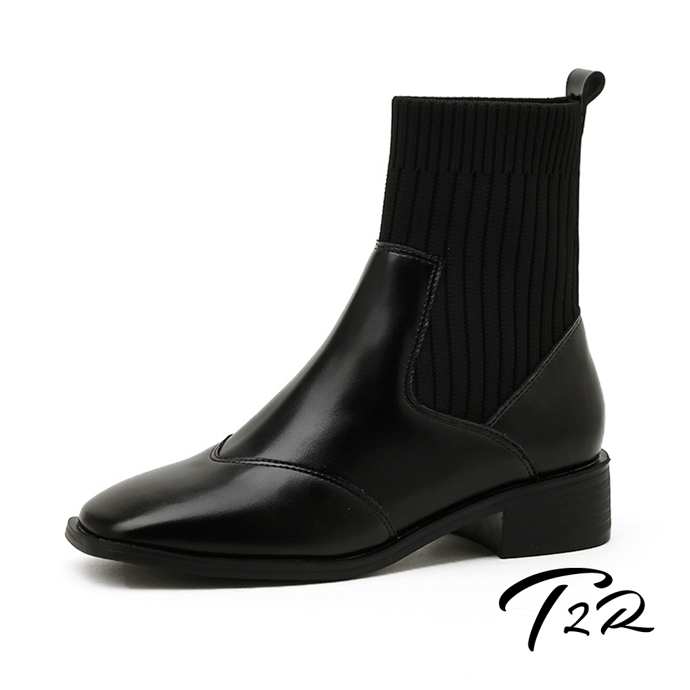 【T2R】正韓空運-真皮針織拼接套腳短筒襪靴-增高約4公分-黑-5985-2783