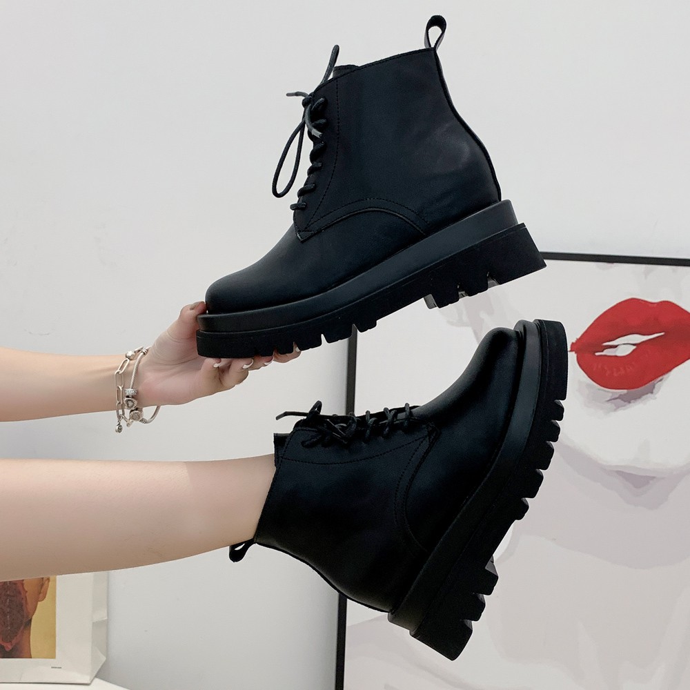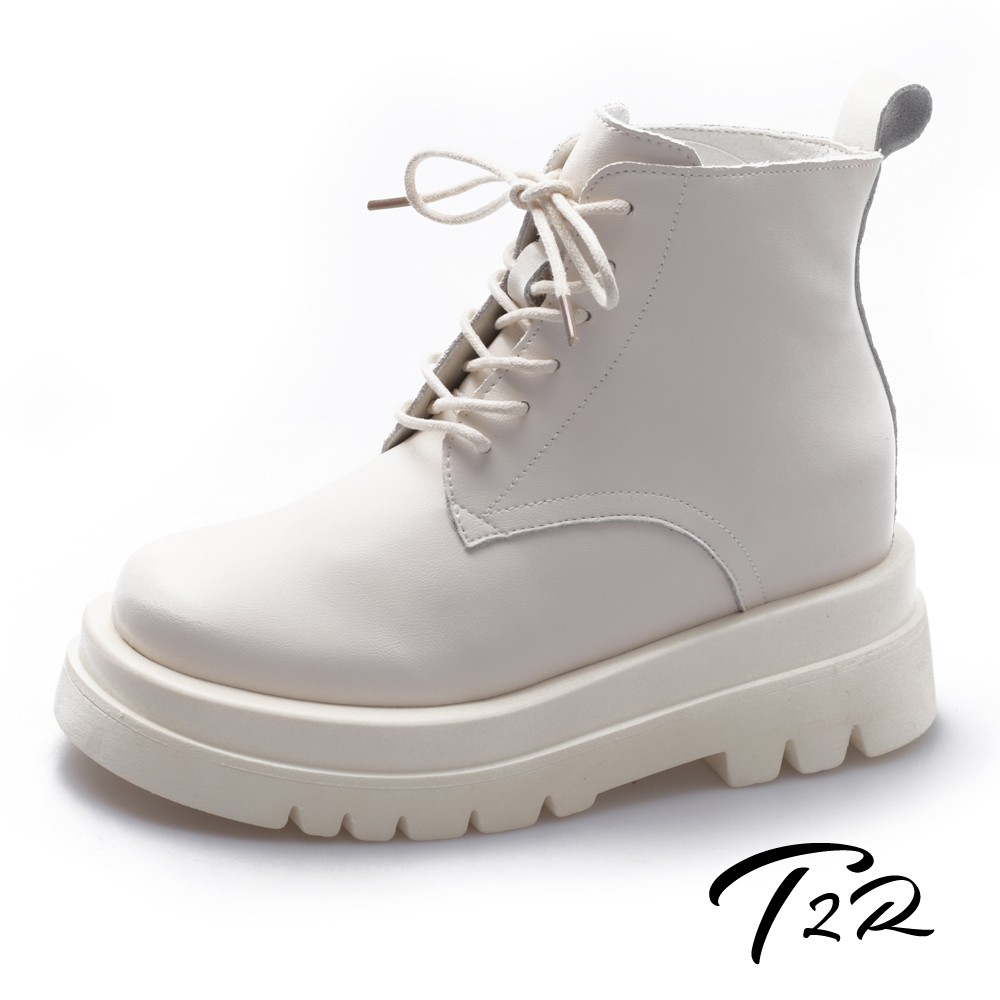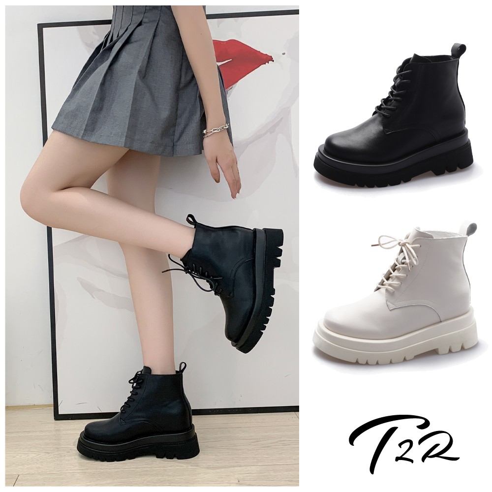 【T2R】正韓空運-全真皮綁帶款低筒隱形增高短靴-增高8公分-黑/米(5985-2007/5985-2008)