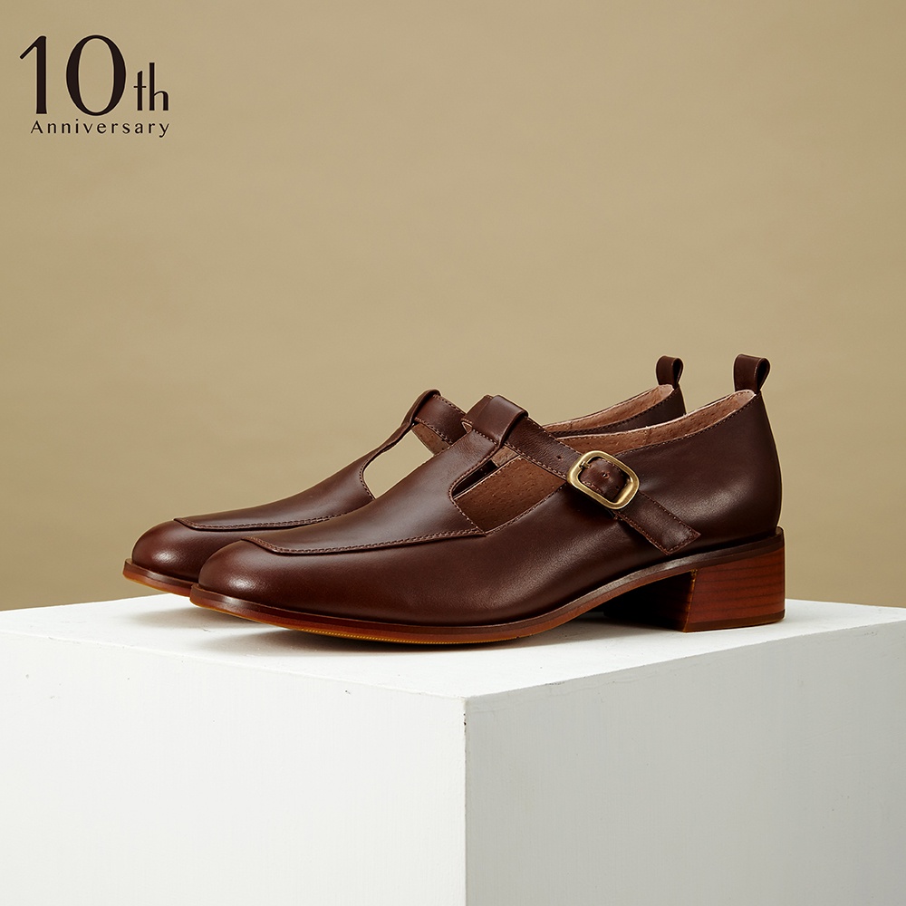 現貨 十週年經典款 HERLS低跟鞋 復古全真皮T字瑪莉珍低跟鞋 深棕色