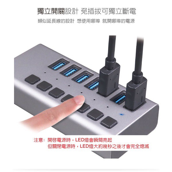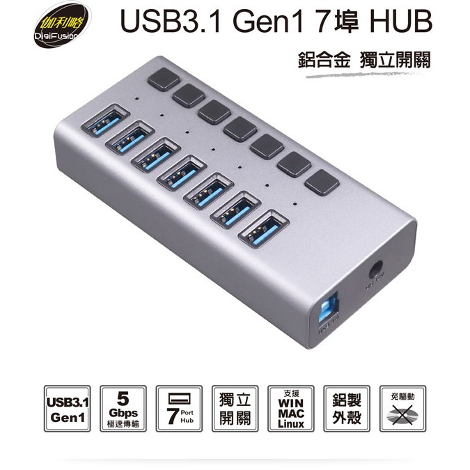伽利略 USB3.1 Gen1 7埠 HUB 鋁合金 獨立開關 PEC-HC707