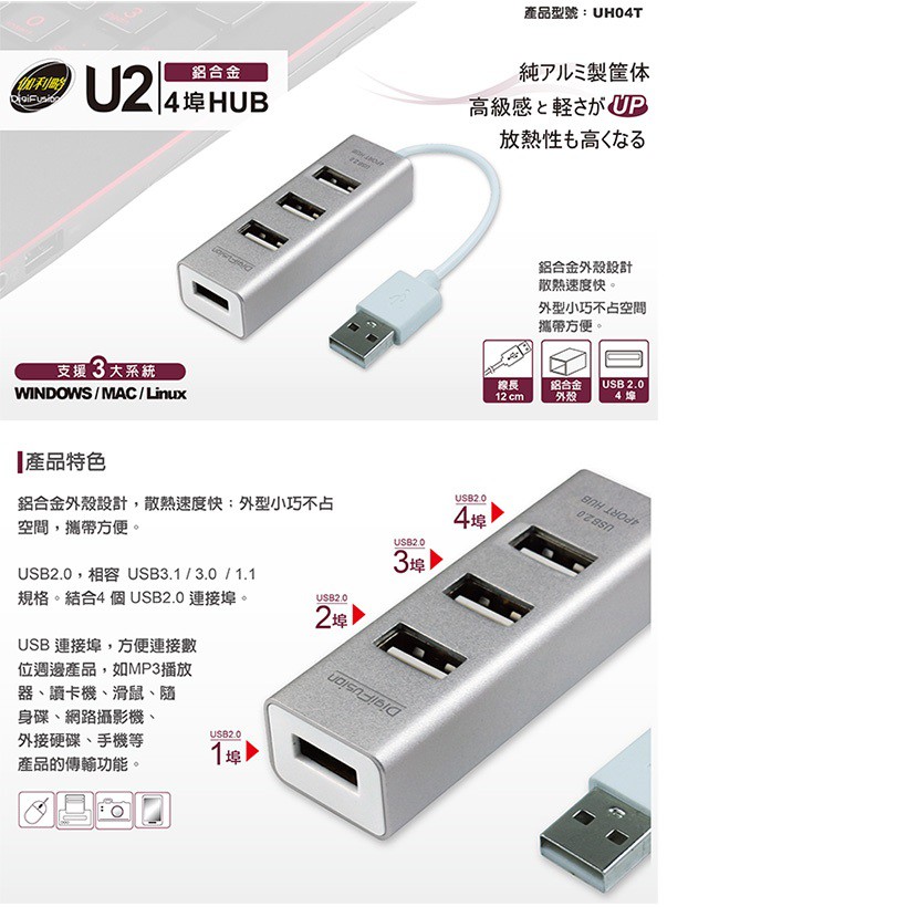 伽利略 USB2.0 4埠 4Port HUB 鋁合金集線器 (UH04T)