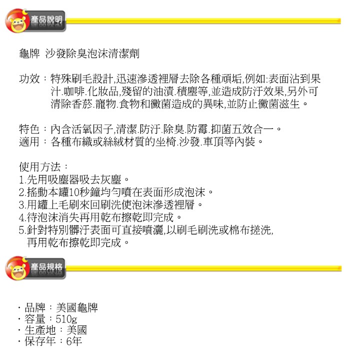 Turtle Wax 美國龜牌 活氧因子沙發除臭泡沫清潔劑 T246