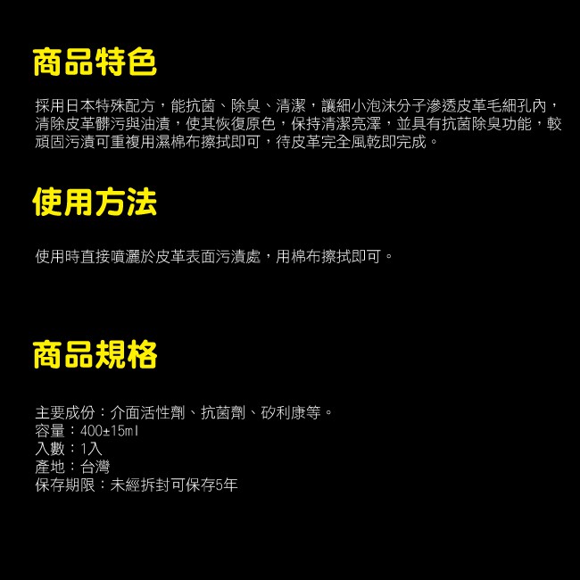 YARK 亞克 車內 皮革清潔保養劑 豔黑系列 抗菌 除臭