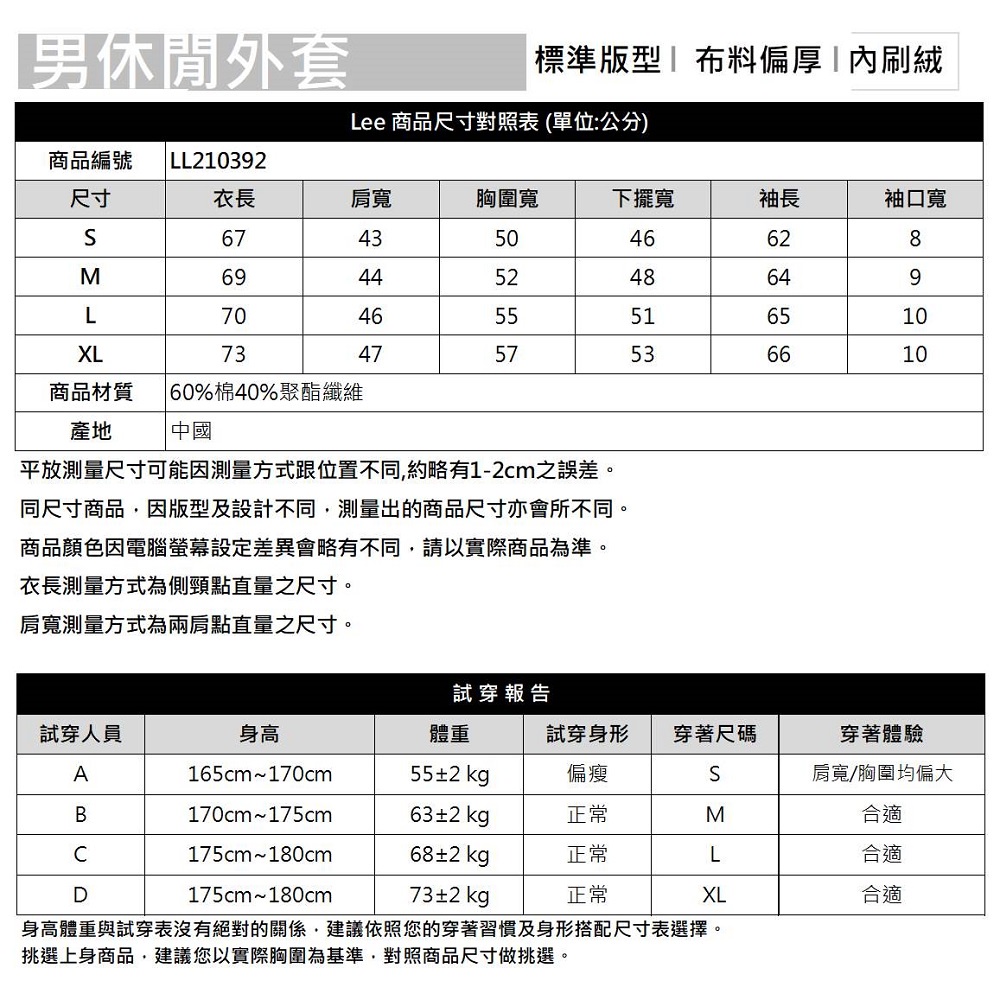 Lee 男女適穿 連帽內刷絨休閒外套 藍 灰 黑 棕 紅 LL210392