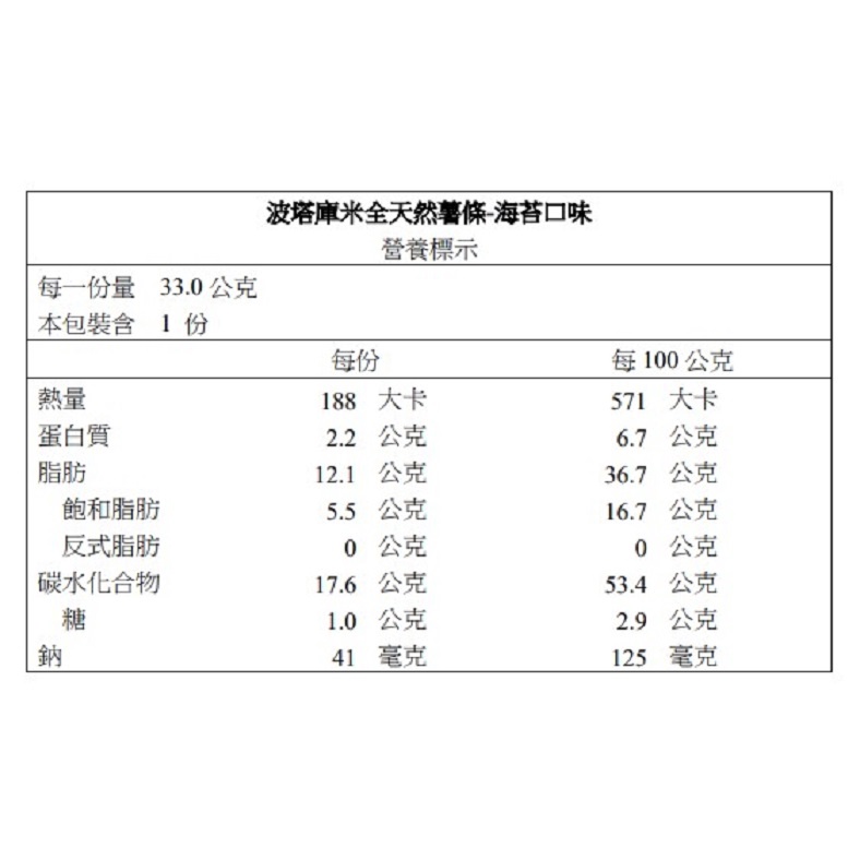 【聯華食品】波塔庫米馬鈴薯薯條海苔口味(33gx20包)|減鈉50%|超商取貨限購2盒