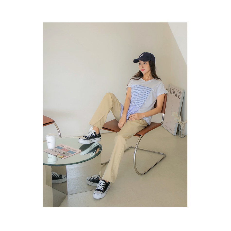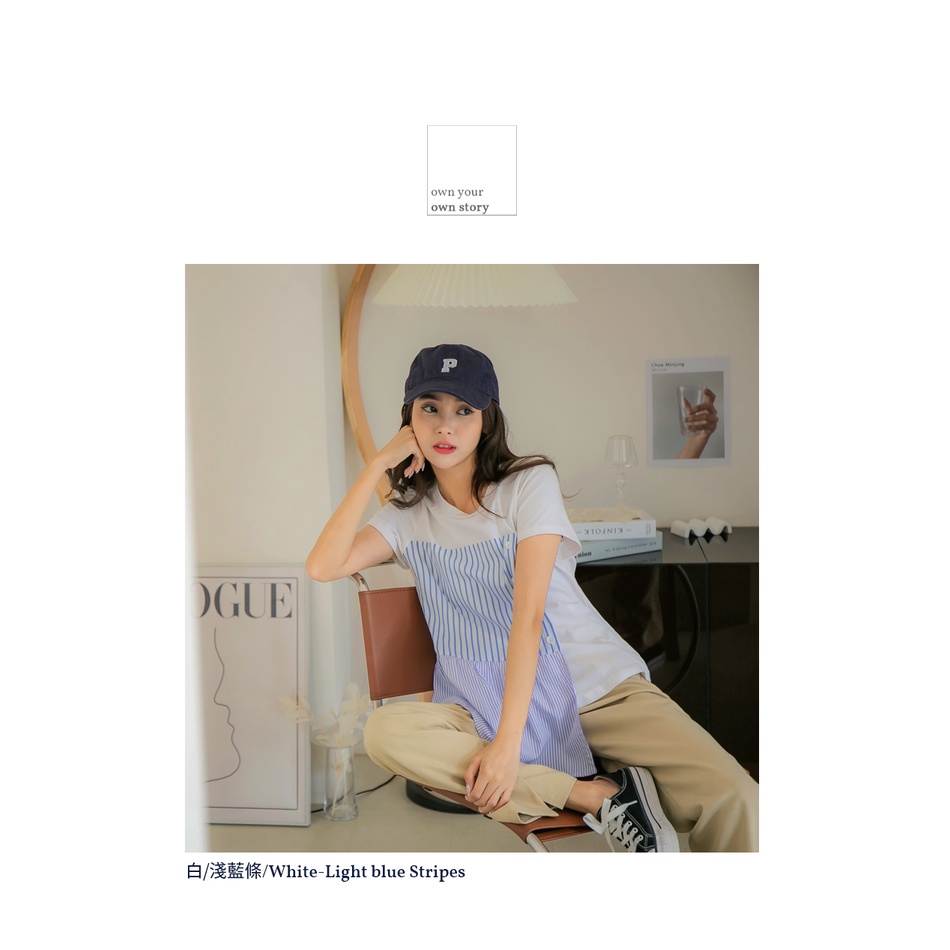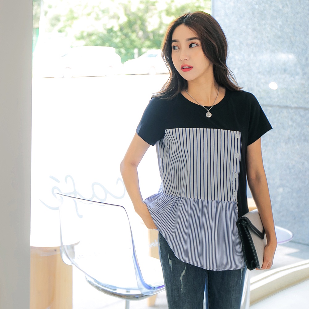 OB嚴選 高含棉不對稱拼接條紋排釦荷葉短袖上衣 《AB15648》全館現貨大尺碼/女裝/現貨