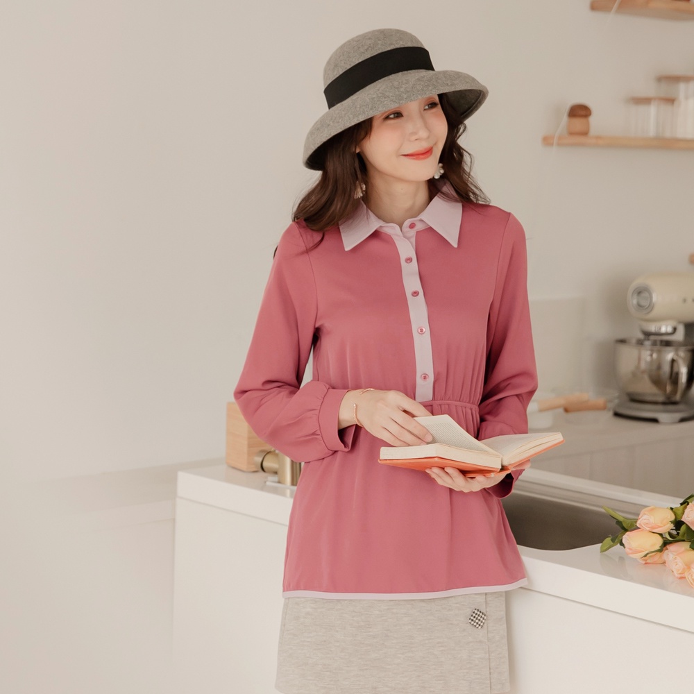 OB嚴選 撞色翻領半開襟彈力收腰不易皺上衣 《AB16241》全館現貨