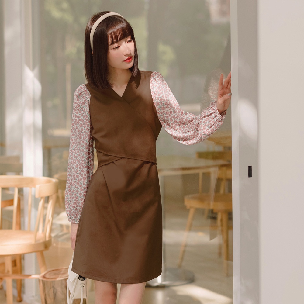 OB嚴選 造型交叉綁帶收腰拼接碎花短洋裝 《DA9039》全館現貨大尺碼/女裝/現貨