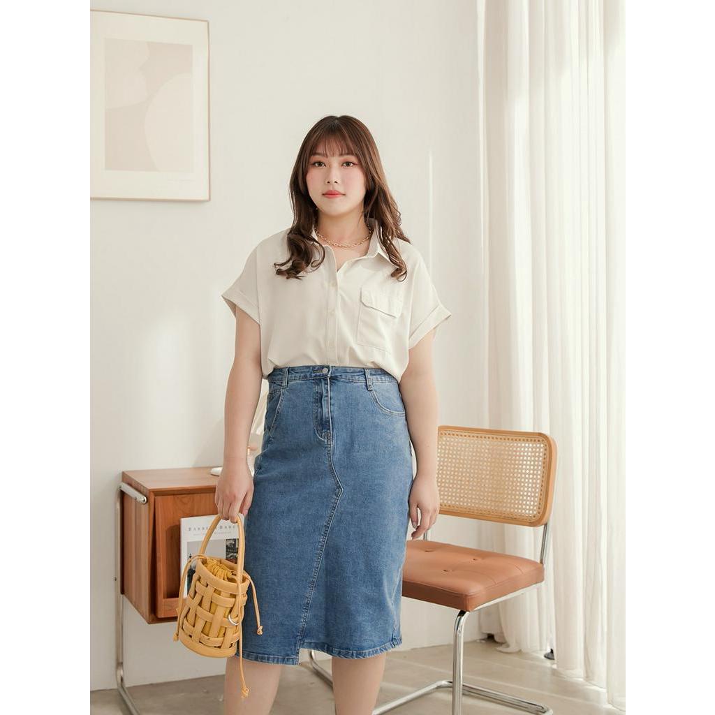 OB嚴選 彈力牛仔造型拼接不規則中長裙 《CA2382》大尺碼/女裝/現貨