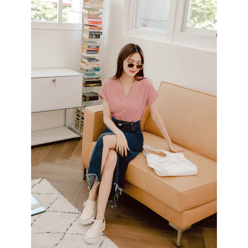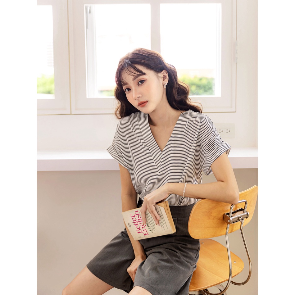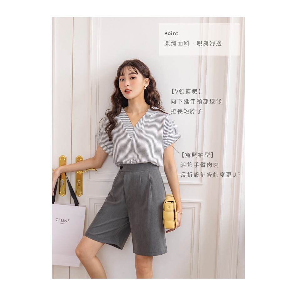 OB嚴選 V領橫條紋寬版反摺短袖上衣 《AB17449》大尺碼/女裝/現貨