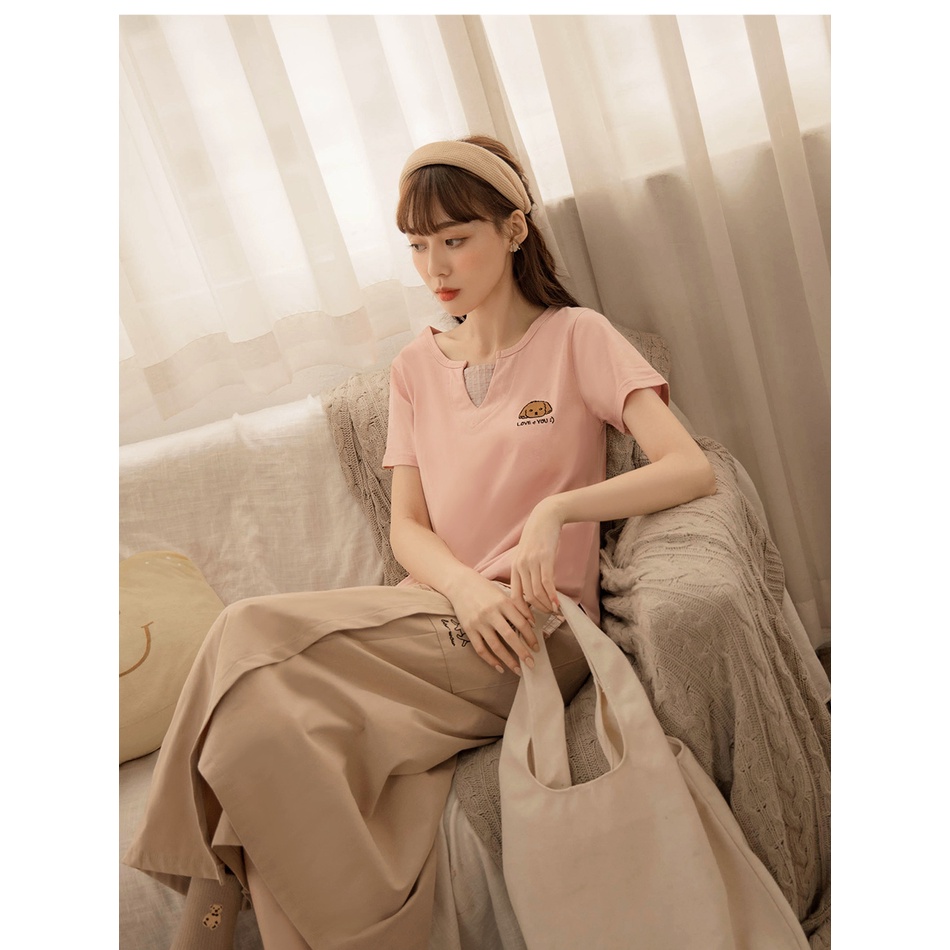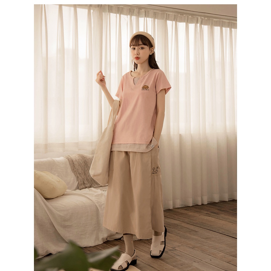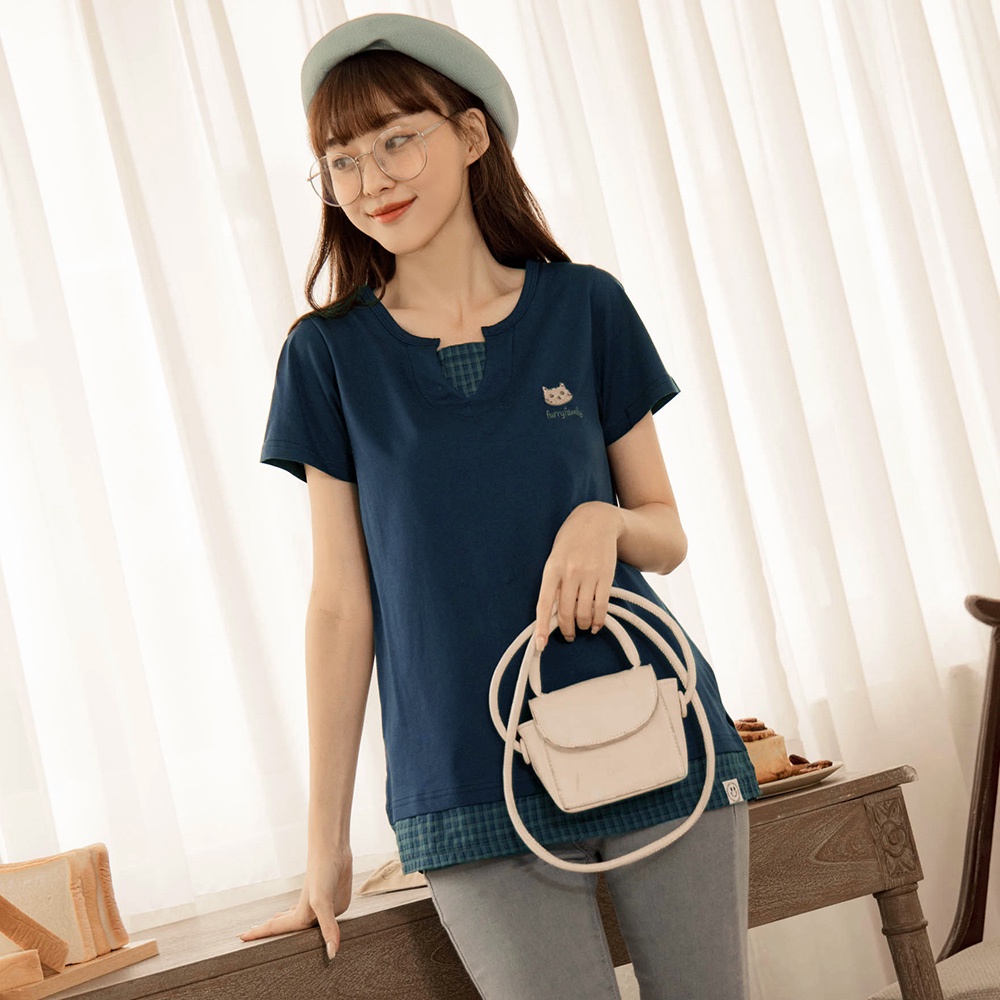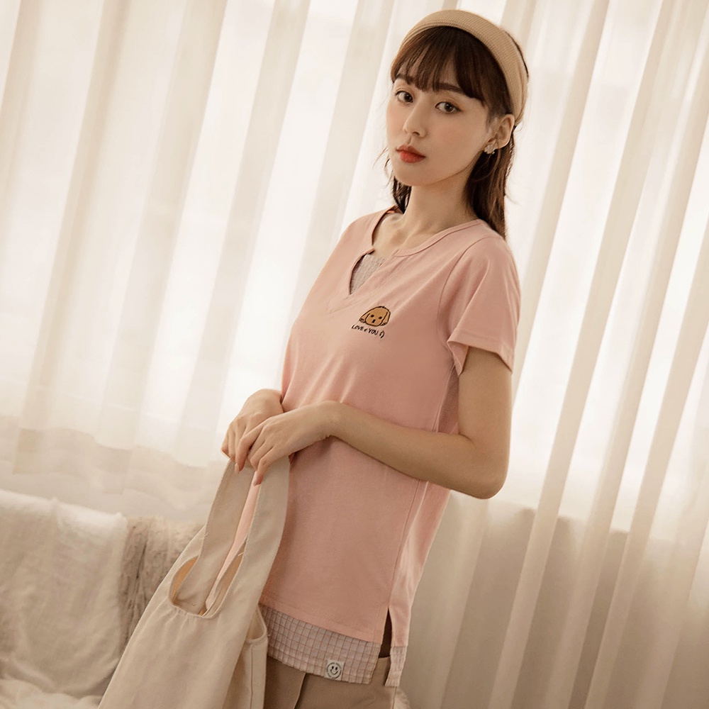 OB嚴選 高含棉貓貓狗狗刺繡假兩件短袖上衣 《KG1249》大尺碼/女裝/現貨